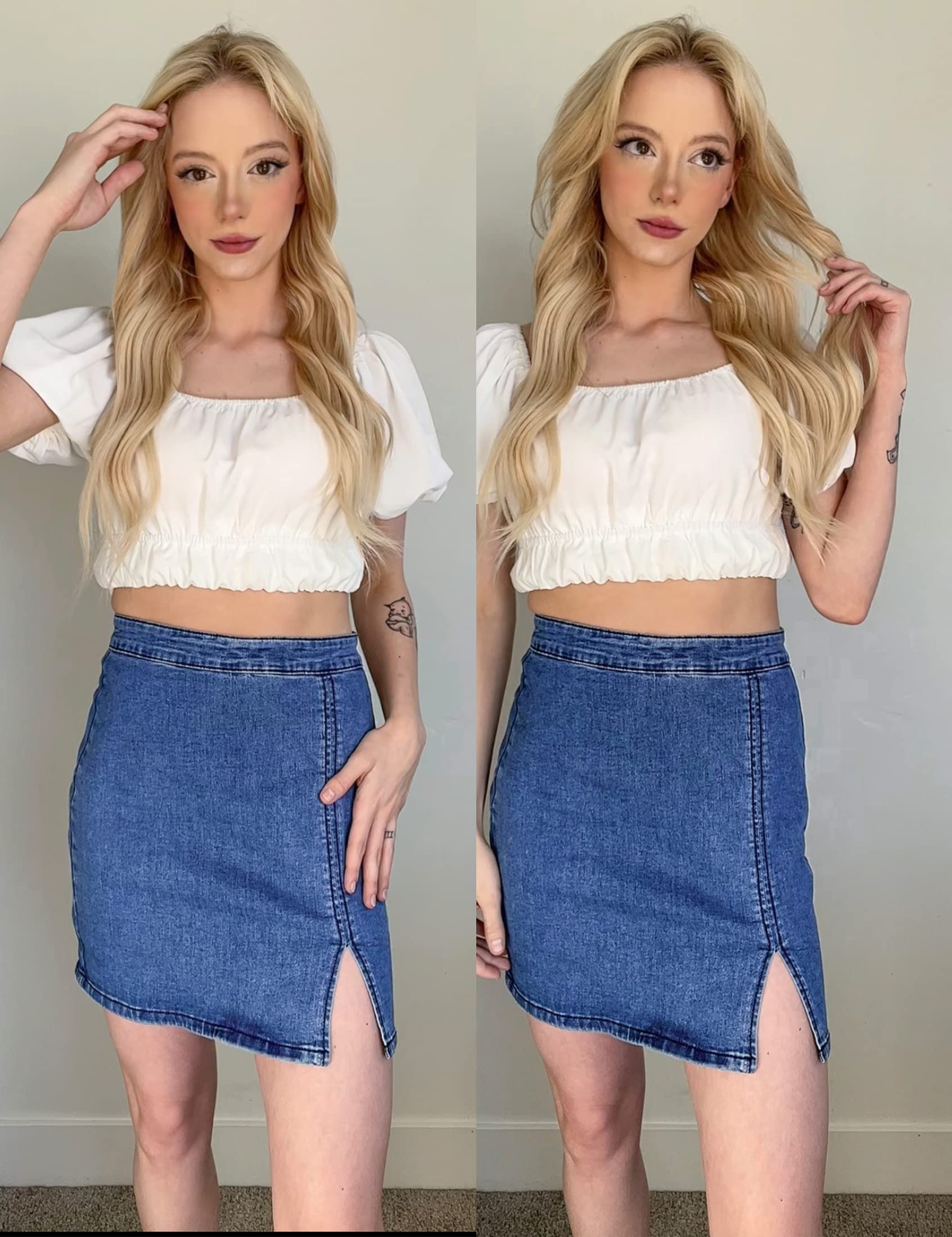 • A denim mini skirt featuring high waisted, a side split and and an exposed back zipper.