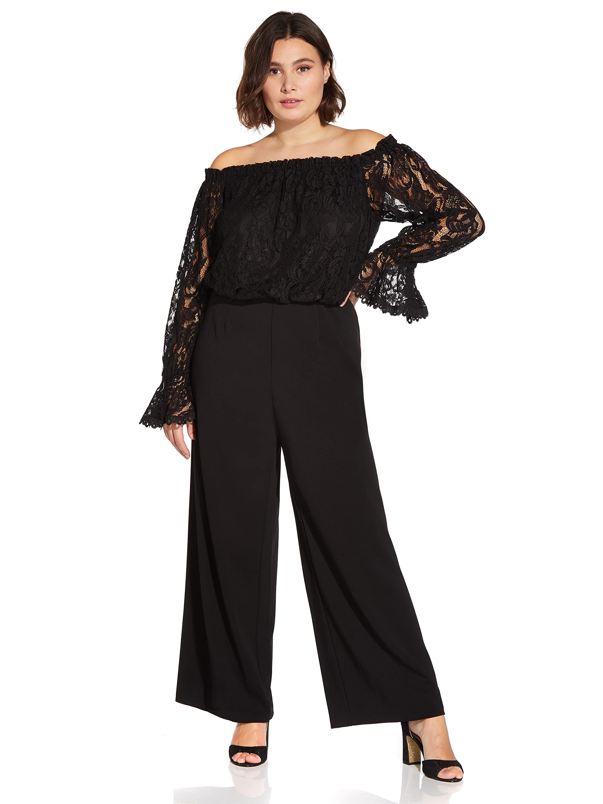 Adrianna Papell Women's Knit Crepe Wide Leg Jumpsuit with Off the Shoulder Lace Top, Black, 22W