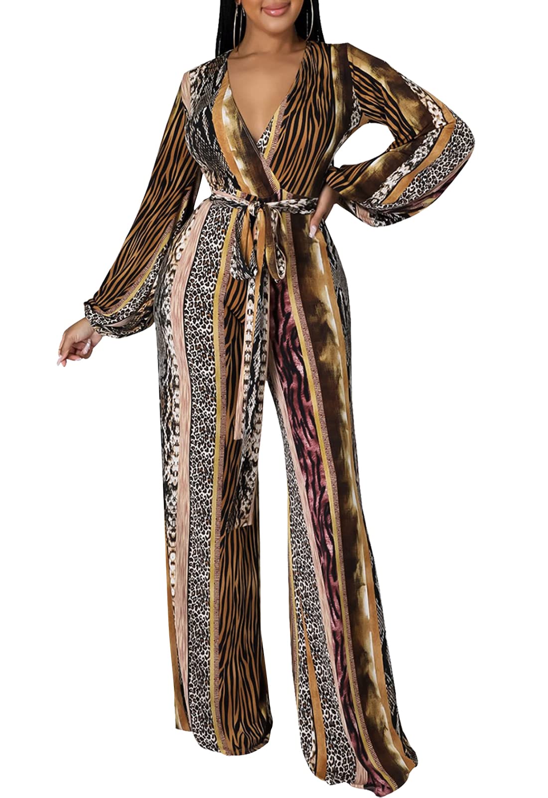 FairBeauty Women's Sexy Floral Print Jumpsuits One Piece Clubwear Deep V Neck Long Sleeve Jumpsuits