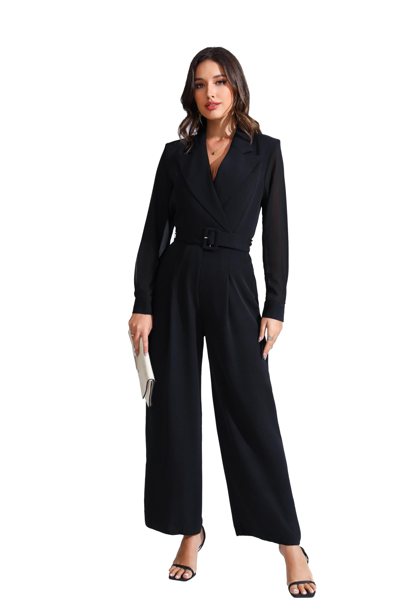 • Design Details: Featuring a wrap bodice, elastic back waistband, chiffon long sleeves, two side pockets, wide-leg long pants, two princess lines on the center front bodice, and two fashion pleated flares on the center front pants. The tailored collar with a self-fabric belt makes this all-in-one jumpsuit a classic and stylish choice to elevate your wardrobe.