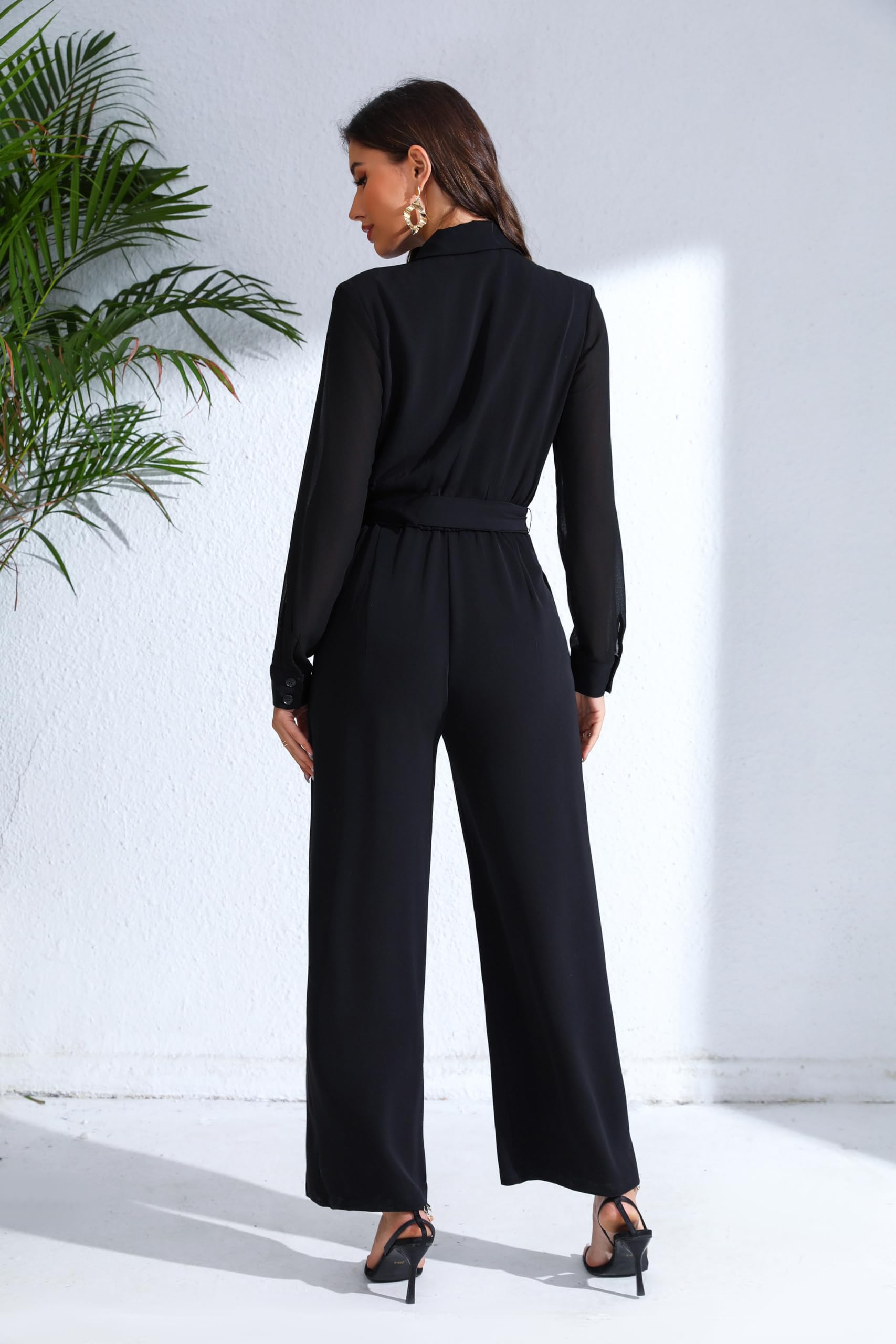 Details: This sophisticated black jumpsuit from Love Welove Fashion, designed with elegant long chiffon sleeves, is the epitome of style and elegance, ideal for formal occasions. Its unique tuxedo-inspired collar, tailored waist, and custom belt exhibit exceptional craftsmanship and attention to detail. The elastic waistband, along with convenient zipper and button closures, ensures ease of wear. This jumpsuit is versatile enough for the office or special events, transitioning seamlessly from day to night. Pair it with high heels and a chic clutch for a complete look. Add this standout piece to your wardrobe today.