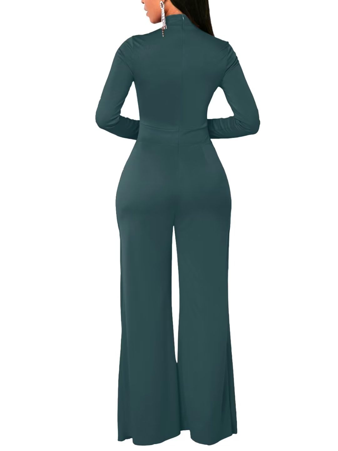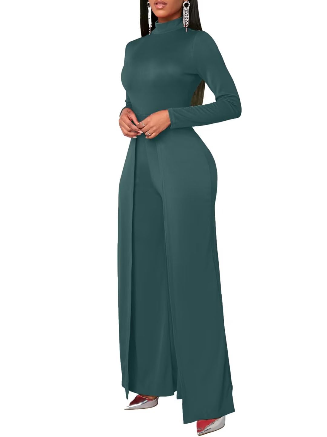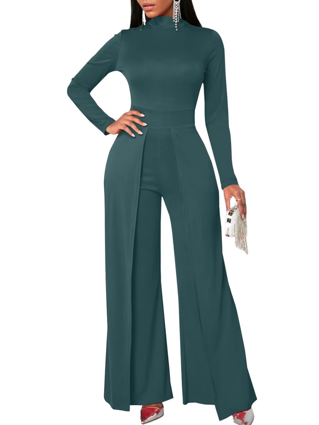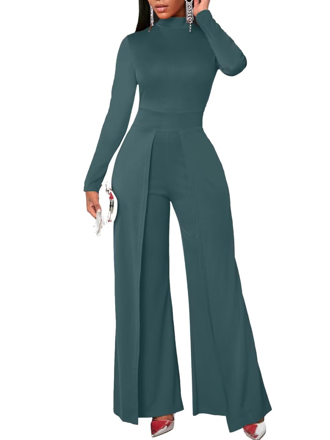 • The one piece jumpsuit features mock neck, long sleeve, wide leg, bodycon fit, long pants with overlay