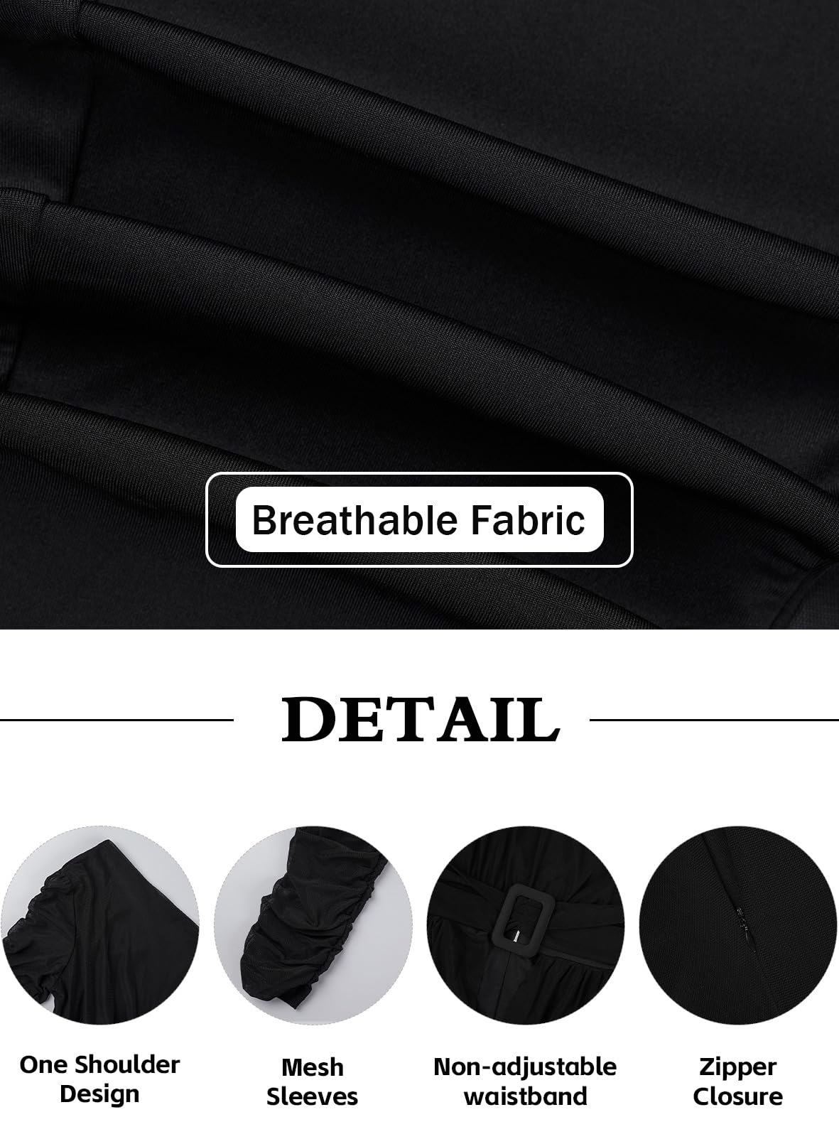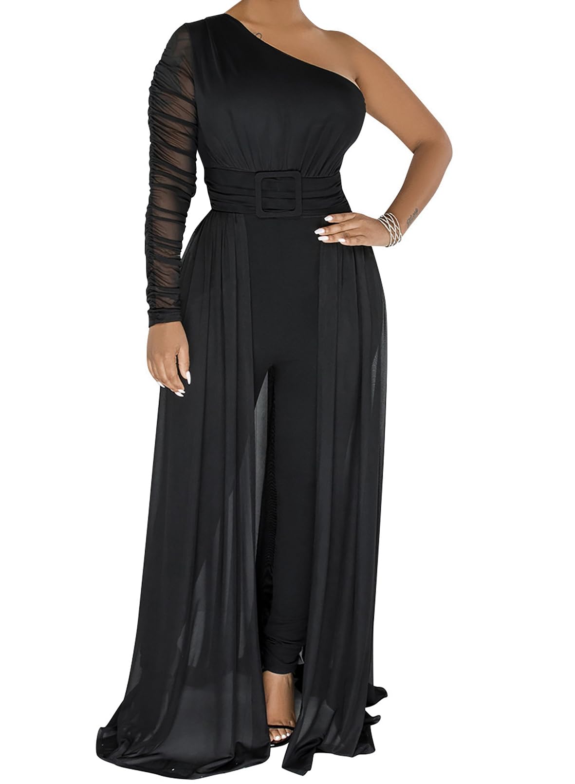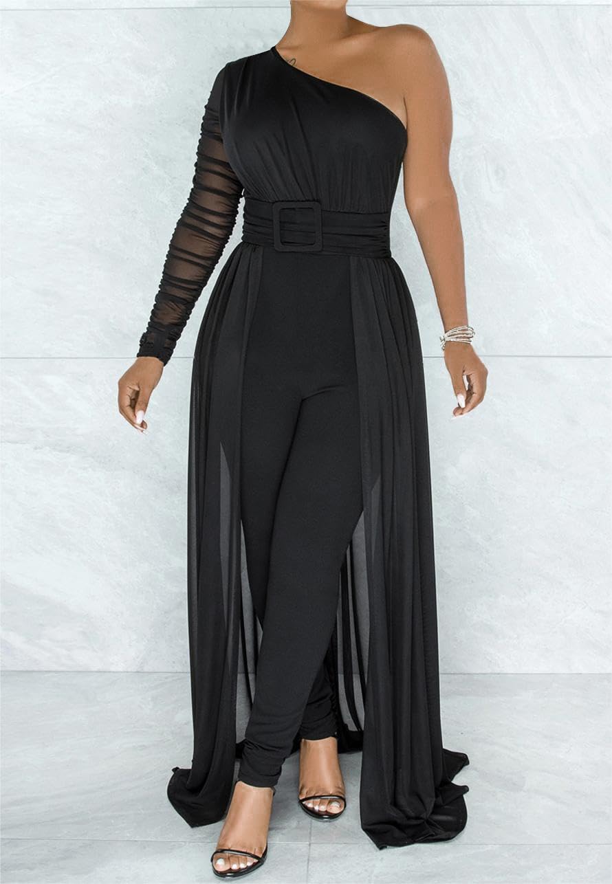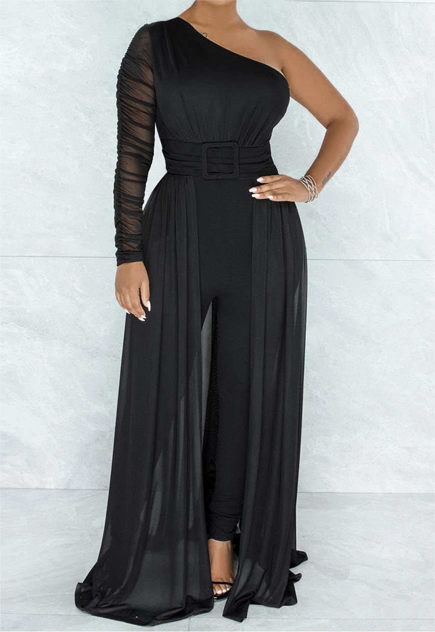 • Features: This sexy one shoulder piece jumpsuit's sleeve is a mesh perspective design, a zipper on the back, and a waist belt attached to the garment, and it is not adjustable.