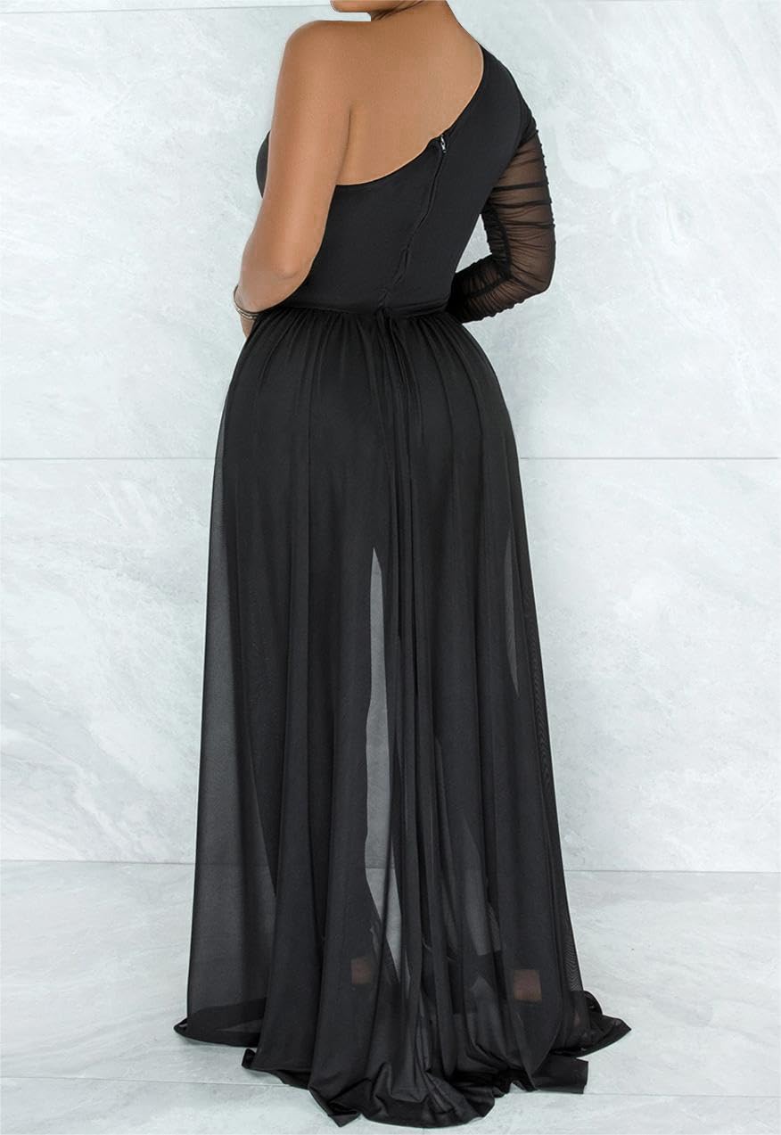 SUZONANA Black Sexy One Shoulder Piece Jumpsuits for Women Formal Long Sleeve Outfit Party Club Night M