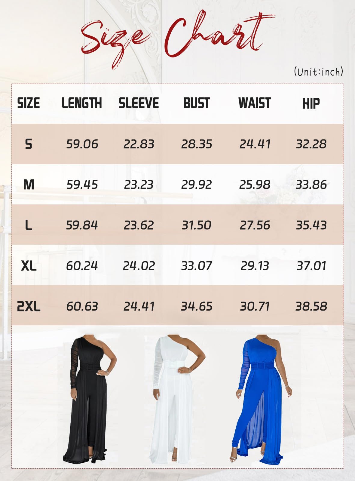 • Sizing Tips: For this women's sexy one shoulder jumpsuit, please allow 0.5-1 inch differences due to manual measurement, and different monitor settings mean the color may vary slightly. If you want a looser fit, please order a size up.