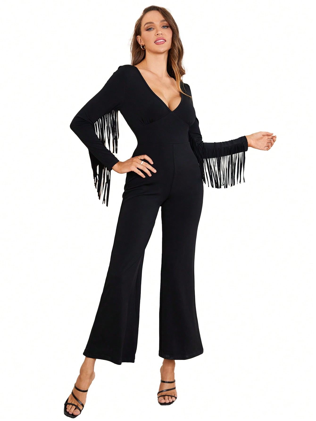 WDIRARA Women's Fringe Trim Straight Leg Jumpsuit V Neck Long Sleeve Casual Long Romper Black L