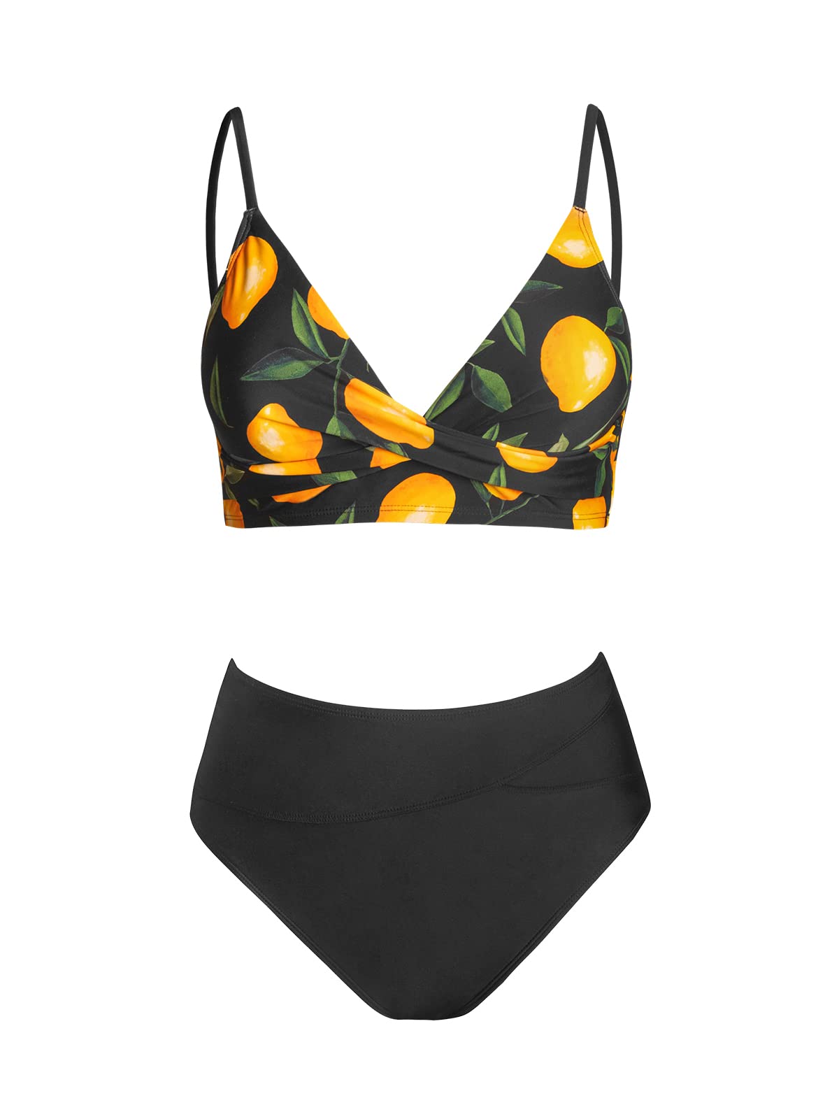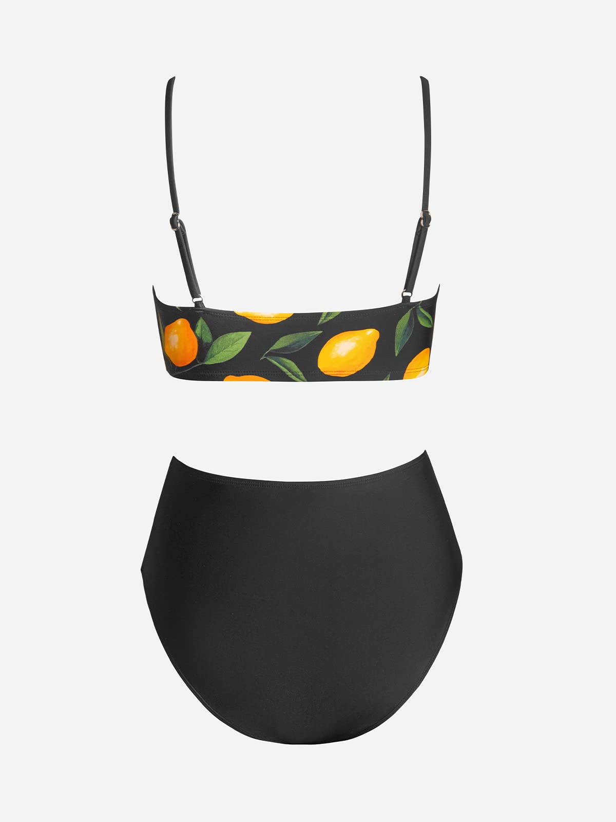 CUPSHE Bikini Sets for Women Two Piece Swimsuits High Waisted Twist Front Adjustable Spaghetti Straps V Neck Back, M Black/Lemon