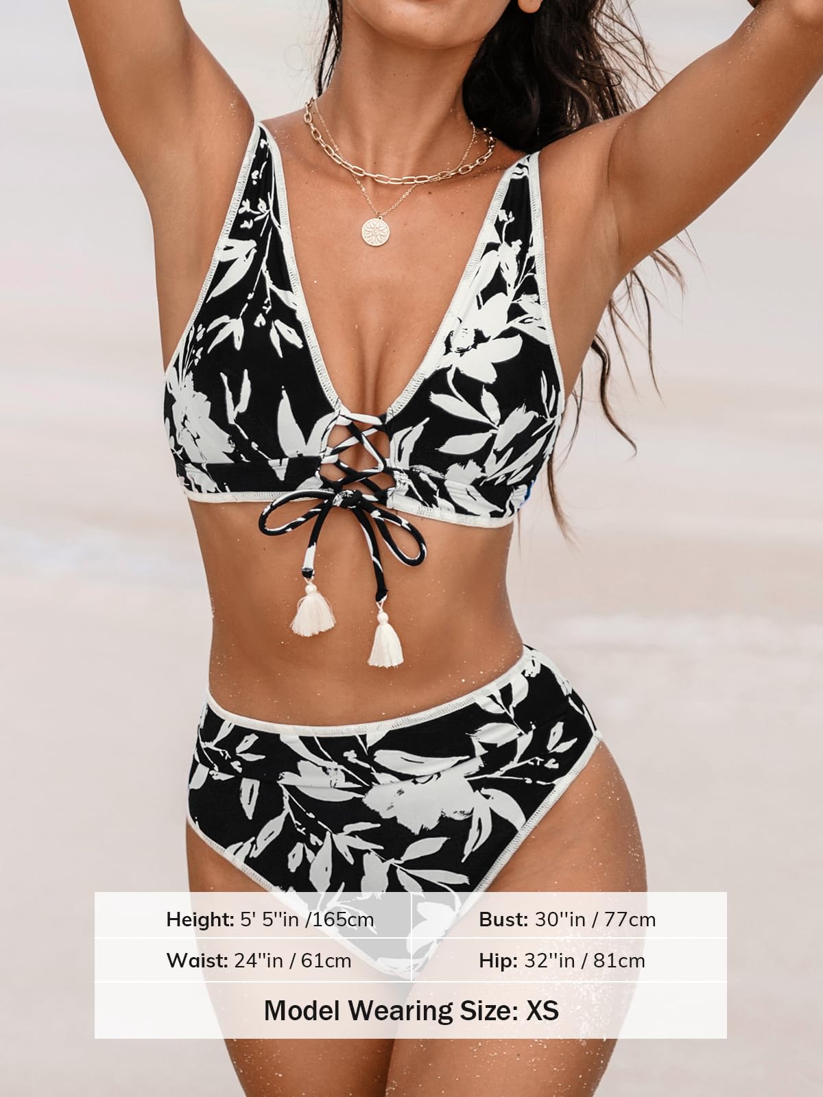 • Design: This two pieces swimsuit for women features a top with a front tie fringe. The wide adjustable straps offers the most comfort. The banded high waisted bottom is detailed with high cut. About cup style: with soft removable cup pads.