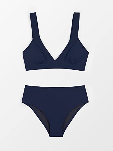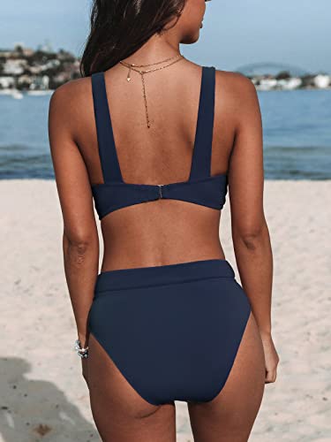 CUPSHE Women Bikini Set for Women Swimsuit High Waisted V Neck Wide Straps Back Hook Removable Soft Cups,M Dark Blue