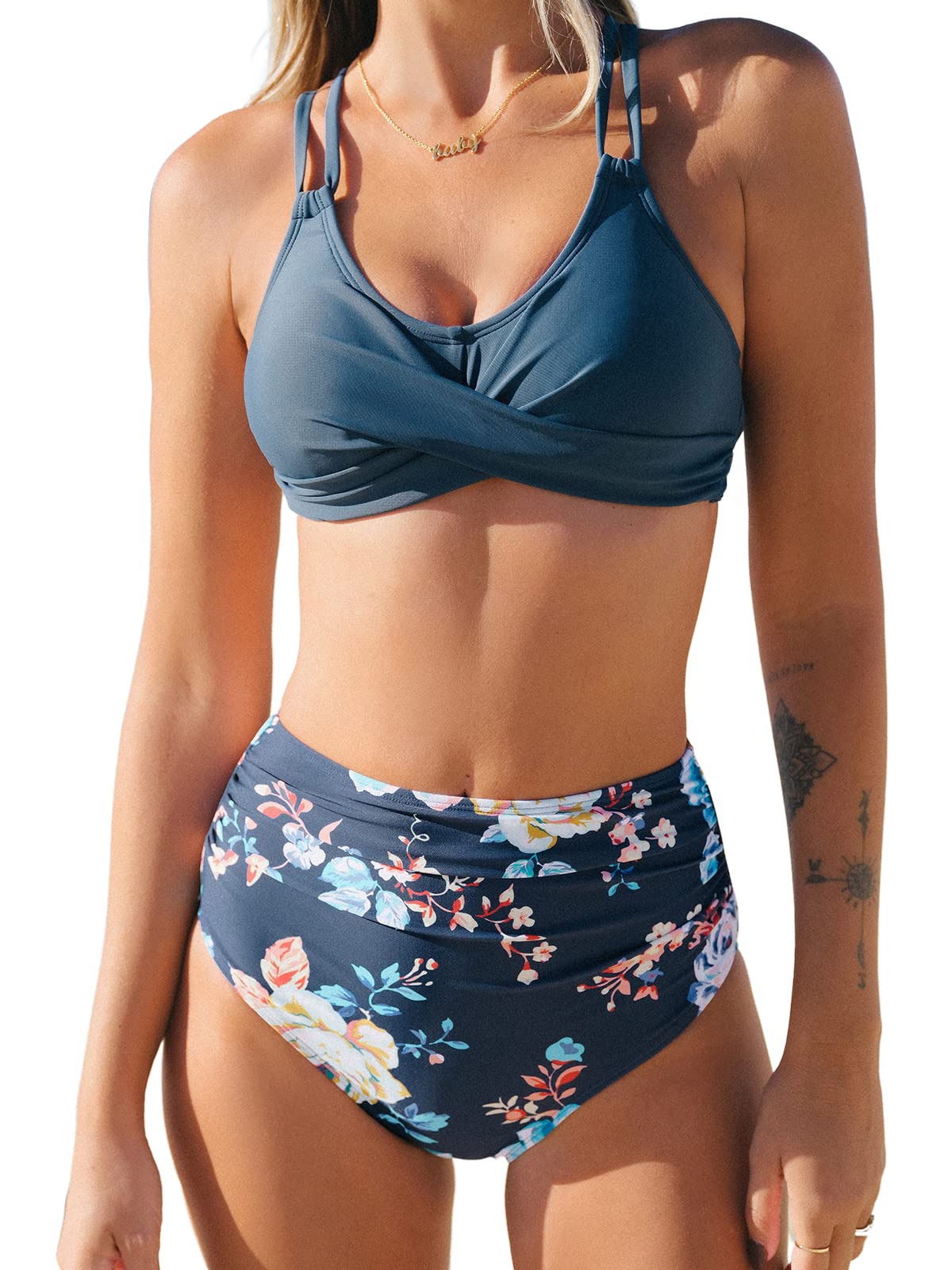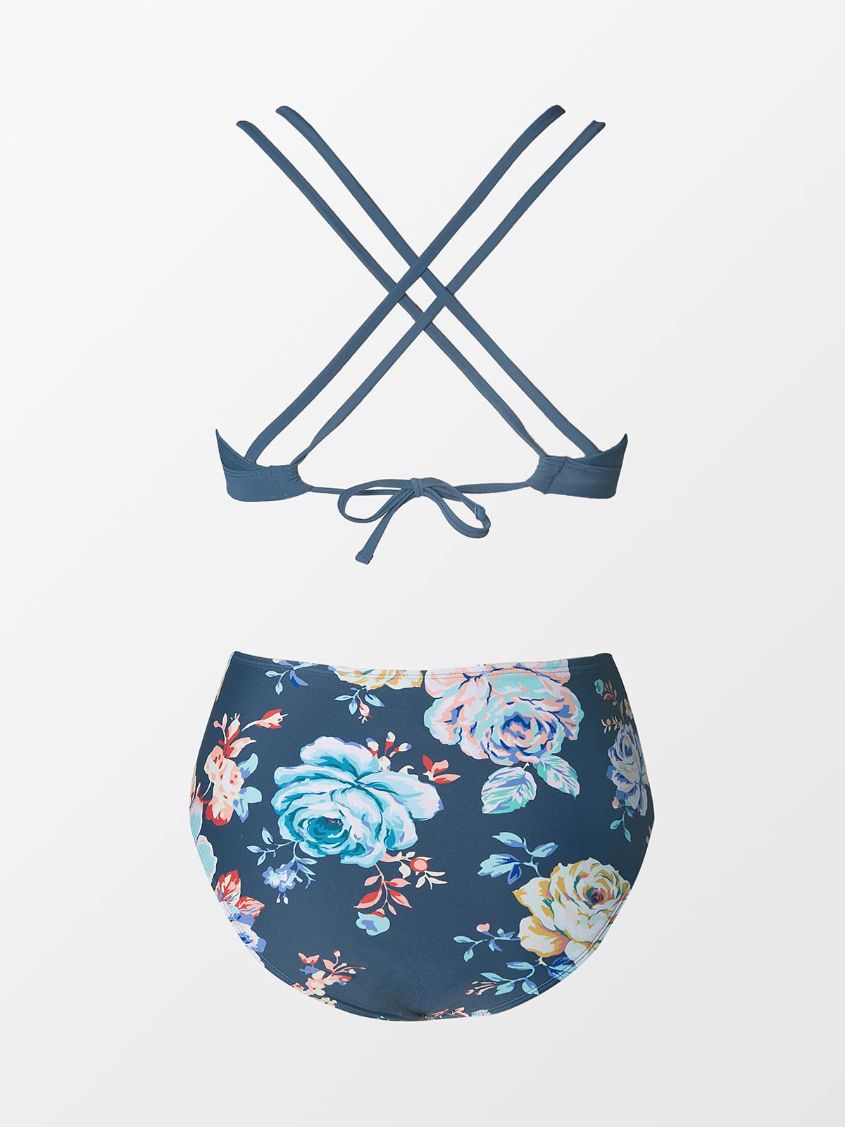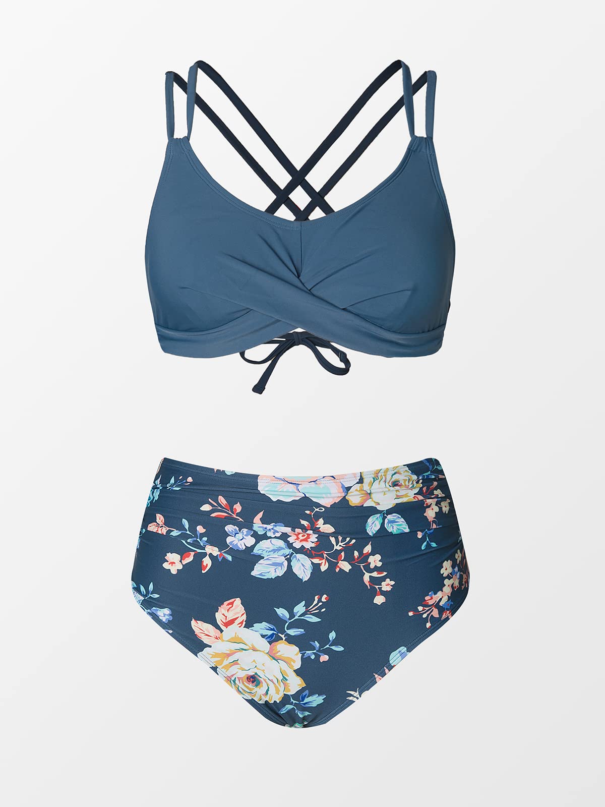 CUPSHE Women Bikini Set High Waisted Bikini Bottom Floral Tummy Control U Neck Double Straps Crisscross Back M