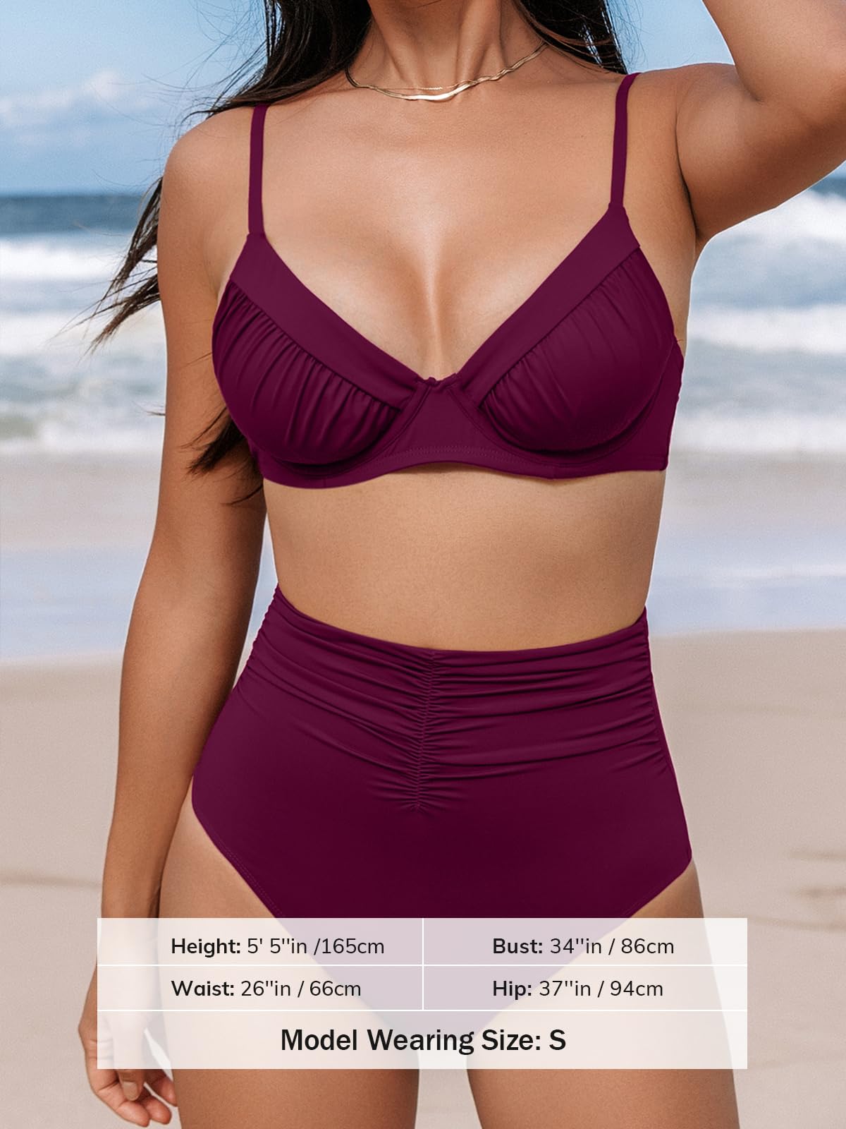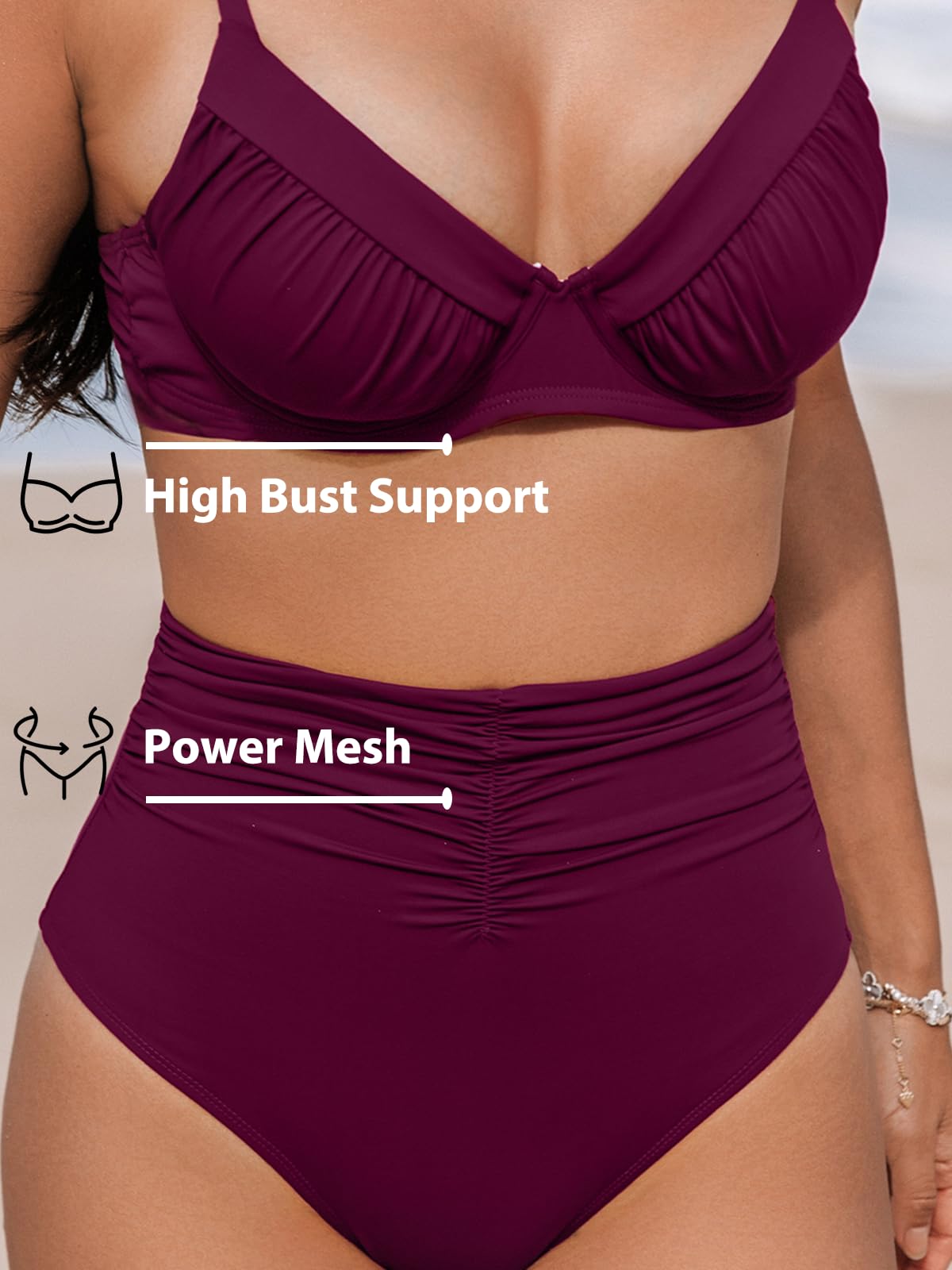 • Design: This Stylish Two Piece Bathing Suit Featuring Adjustable Spaghetti Straps and Back Hook are Comfortable. Plunging V Neck and Ruched Details Add a Touch of Elegance. The Bikini Top with Underwire Cups is for High Bust Support, While the High Waisted Bottom with Power Mesh Makes You Sculpting and Slimming.
