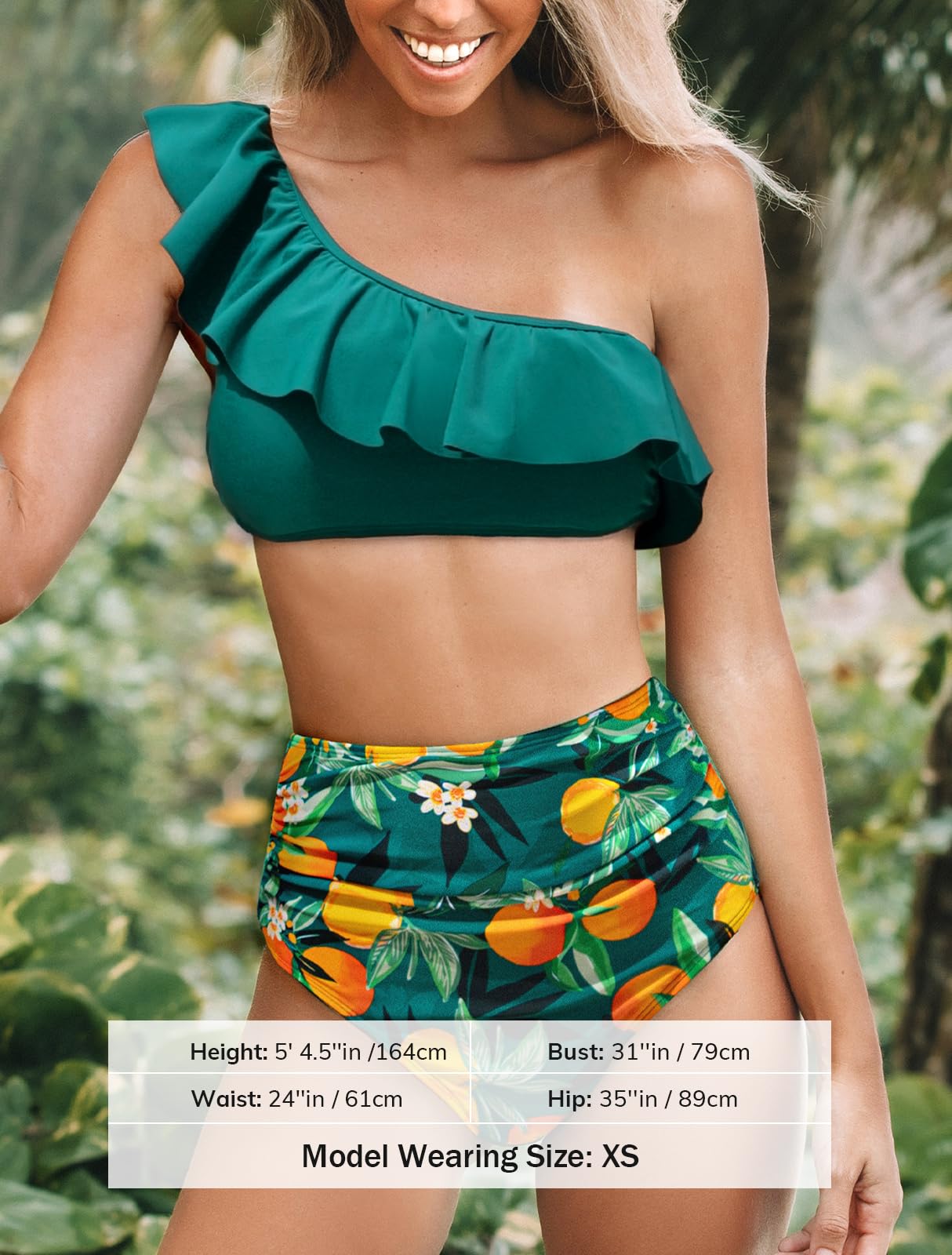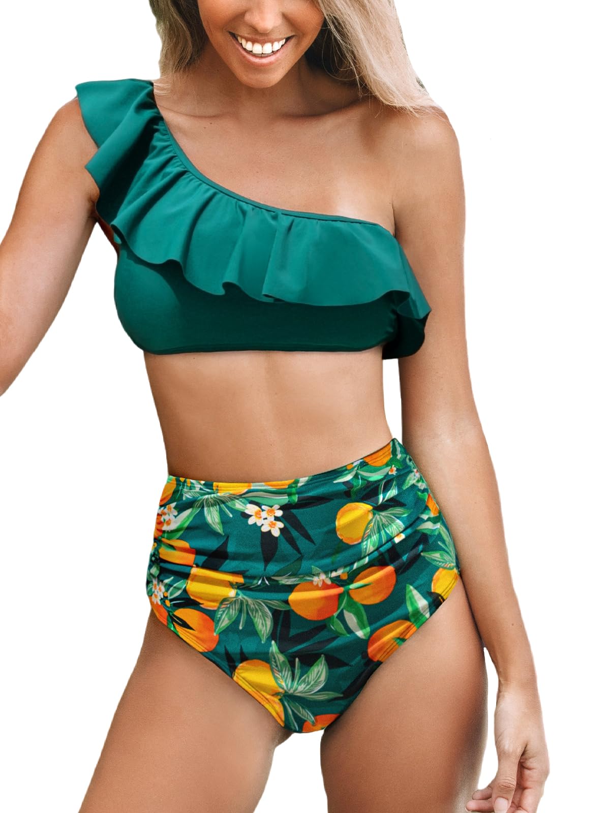 • Design: Level up your beach vacation with the two piece swimsuit! The vivid color, one shoulder design, and ruffled detail will turn heads. The shirred hign wasited bottom add a touch of stylish style.
