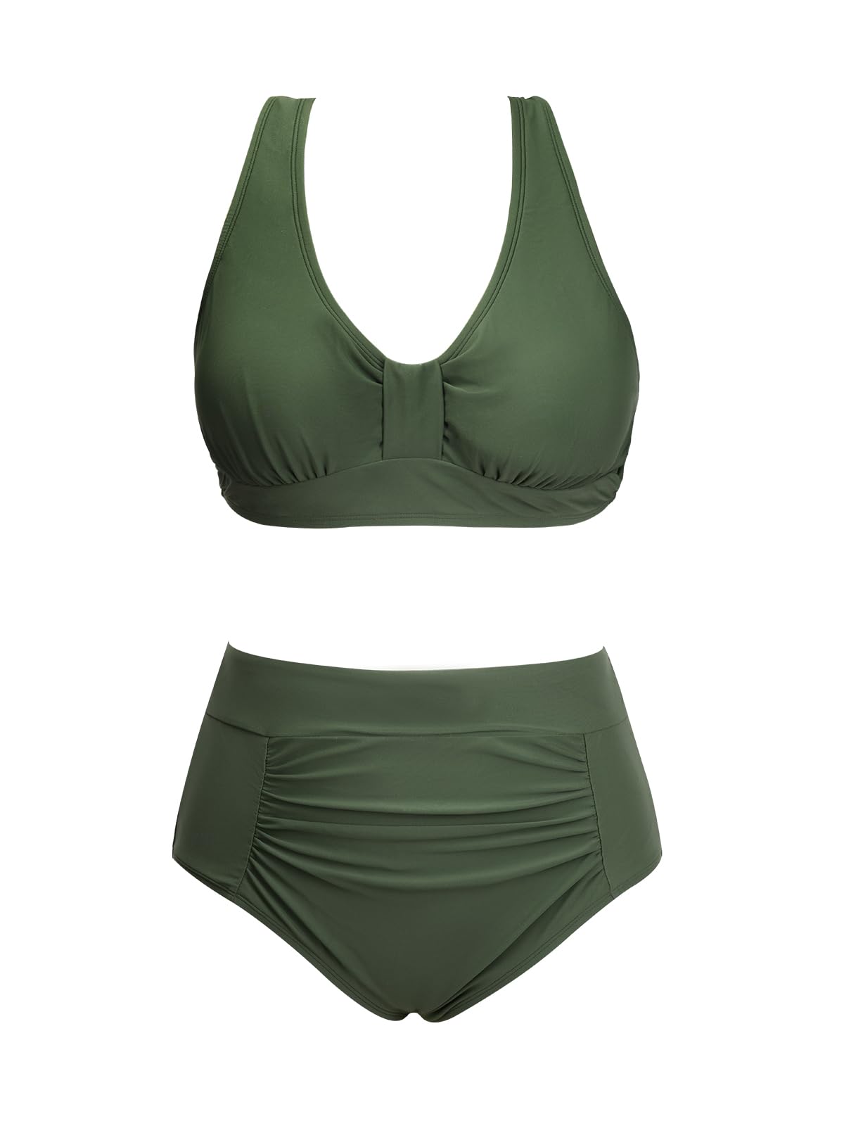 CUPSHE Women's Bikini Sets Two Piece Swimsuit V Neck Knot Front Swimwear High Waisted Shirred Bottom M Army Green