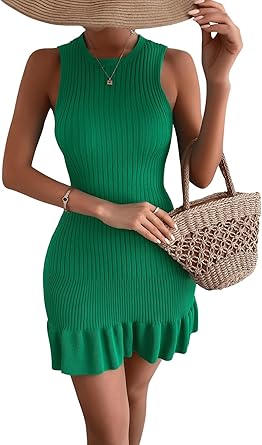 MakeMeChic Women's Sleeveless Sweater Dress Ribbed Knit Ruffle Hem Mini Dress Bodycon Crochet Dress
