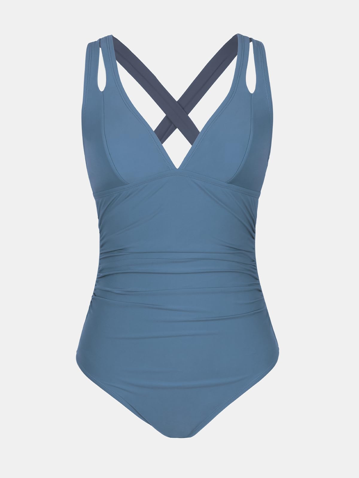 • Design:The classic one piece swimsuit featuring a deep v neckline, side ruching, and shoulder straps that lead to a crisscross self tie back