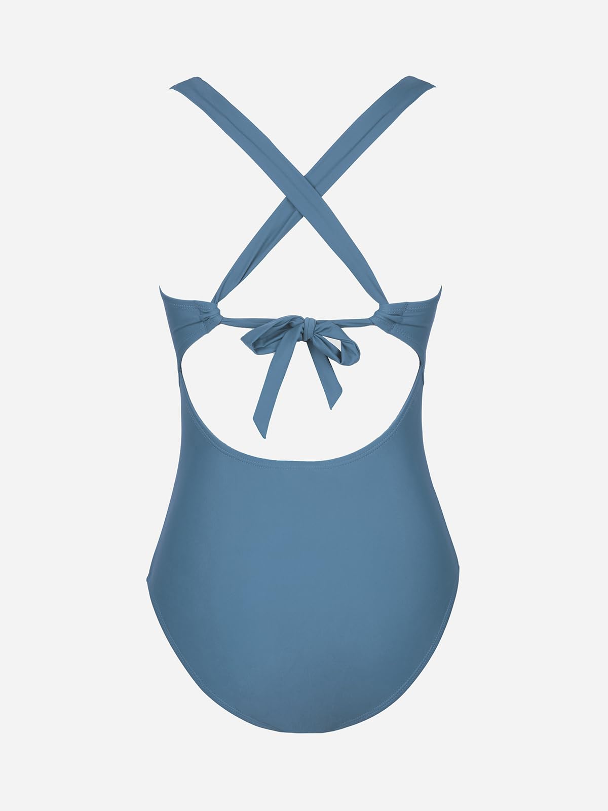 CUPSHE Women One Piece Swimsuits Tummy Control Deep V Neck Double Straps Crisscross Back Tie Bathing Suits, M Stone Blue