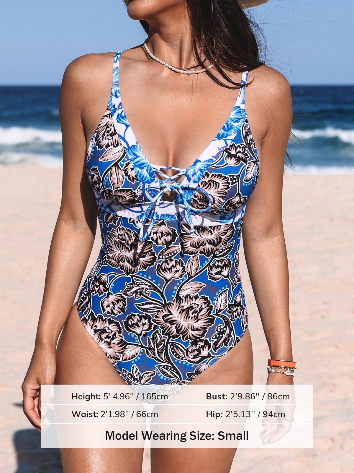 CUPSHE Women Swimsuit One Piece Deep V Neck Self Tie Tummy Control Paneled Floral Bathing Suit, M