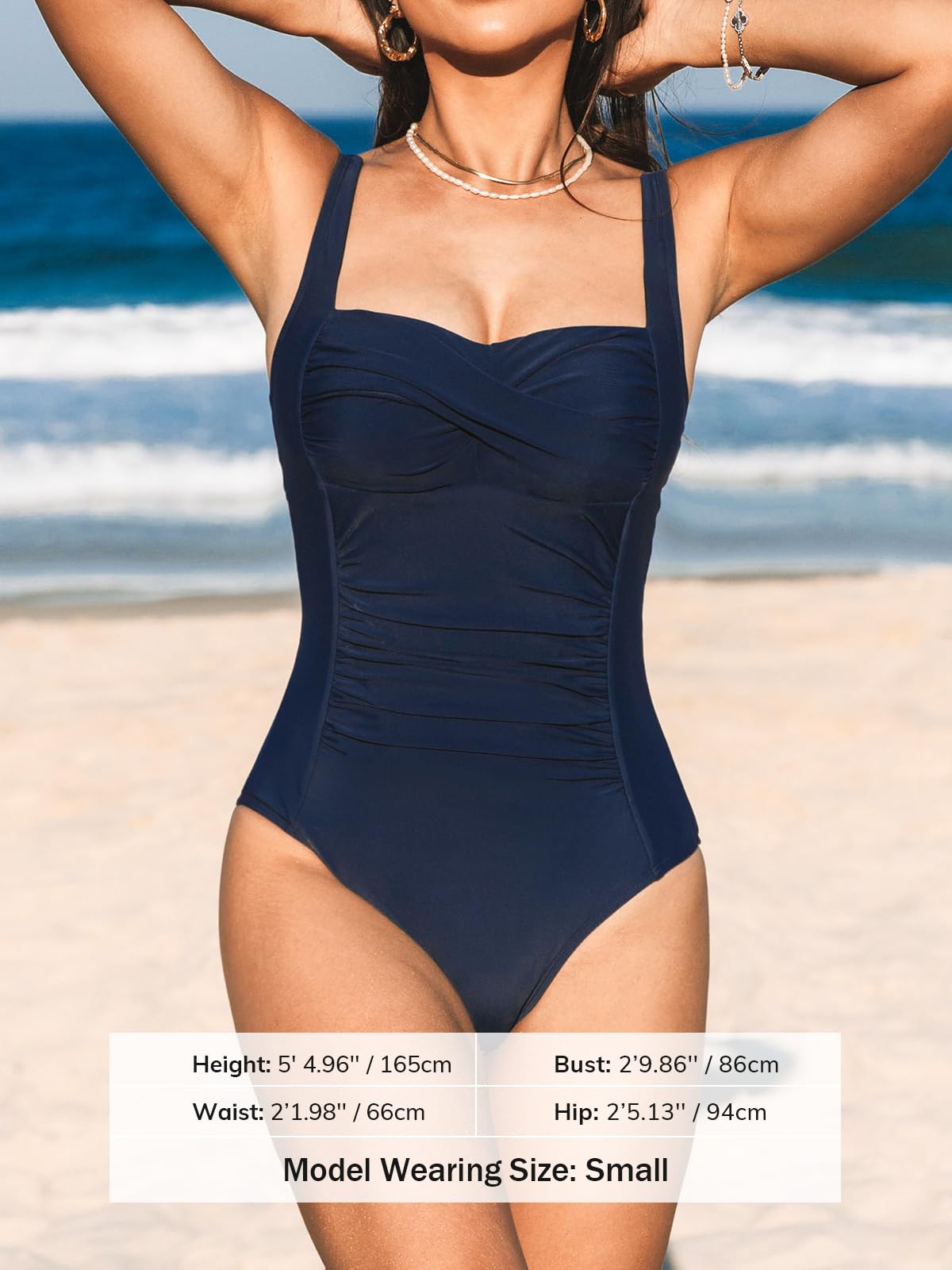 • Design: Crazy about this square neck one piece swimsuit with adjustable wide straps! Feeling elegance from the dark blue bathing suit with a wrapped tummy control front and modest full coverage