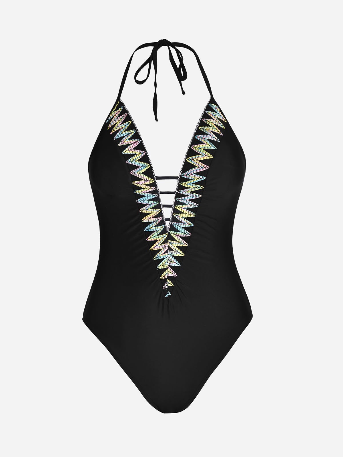 • Design:This one piece swimsuit boasts a mesmerizing combination of style and functionality.Deep V-neck for allure, stylish cutouts, wave stitching for durability, and a halter self-tie for adjustable support. Ensuring confidence and comfort whether lounging poolside or catching waves at the beach.