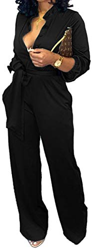SeNight Jumpsuits Elegant Women Sexy V Neck Long Sleeve Jumpsuit for Work Wide Leg Pants Rompers with Pockets Belt