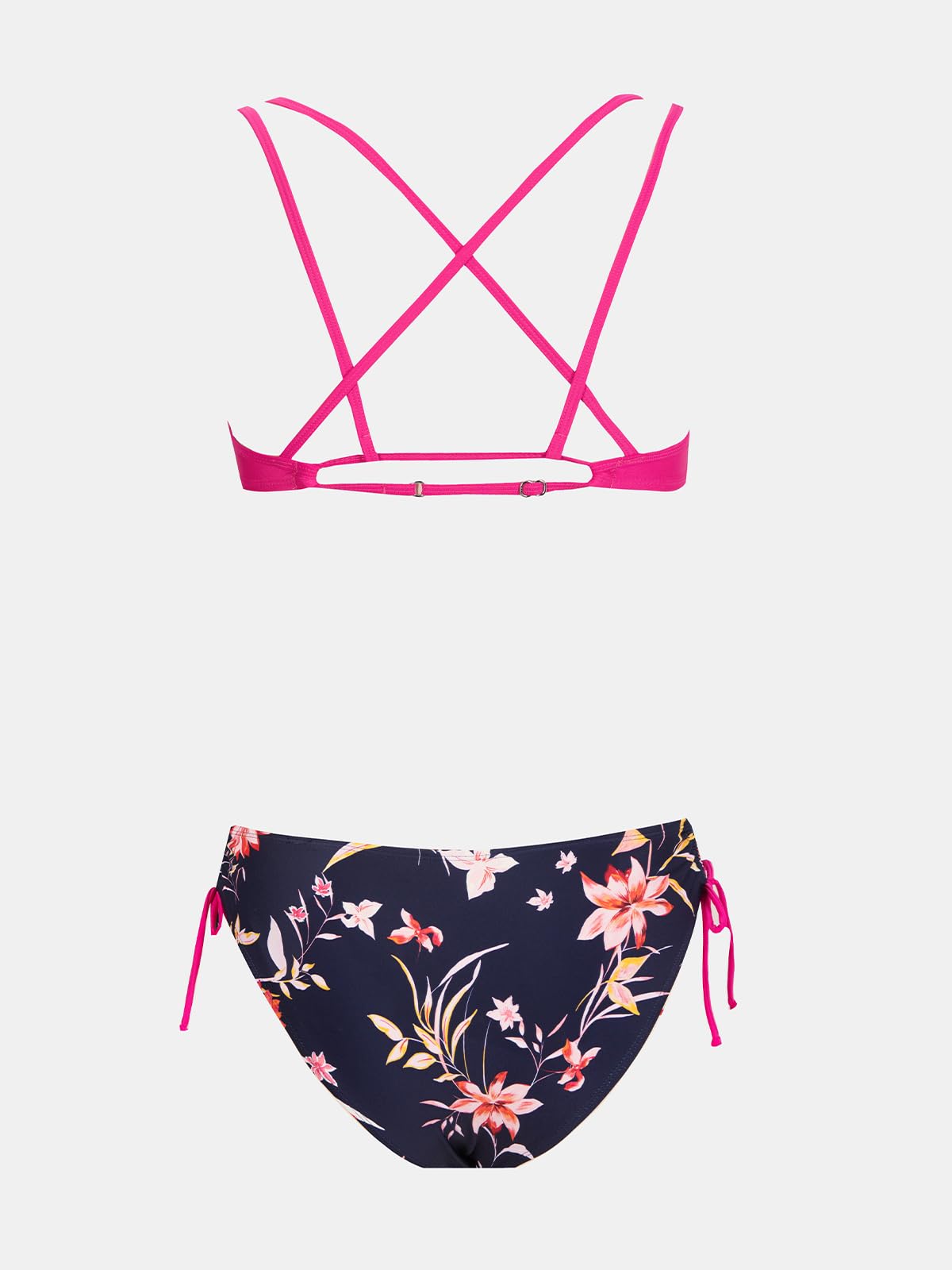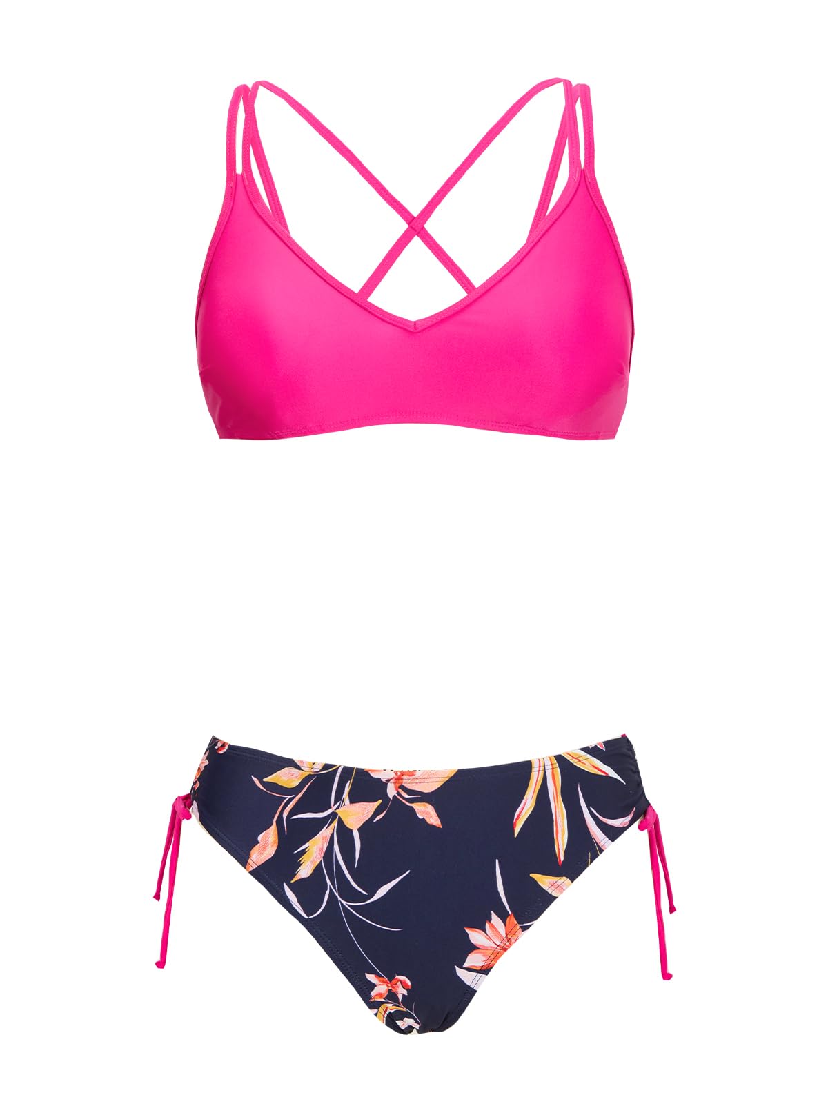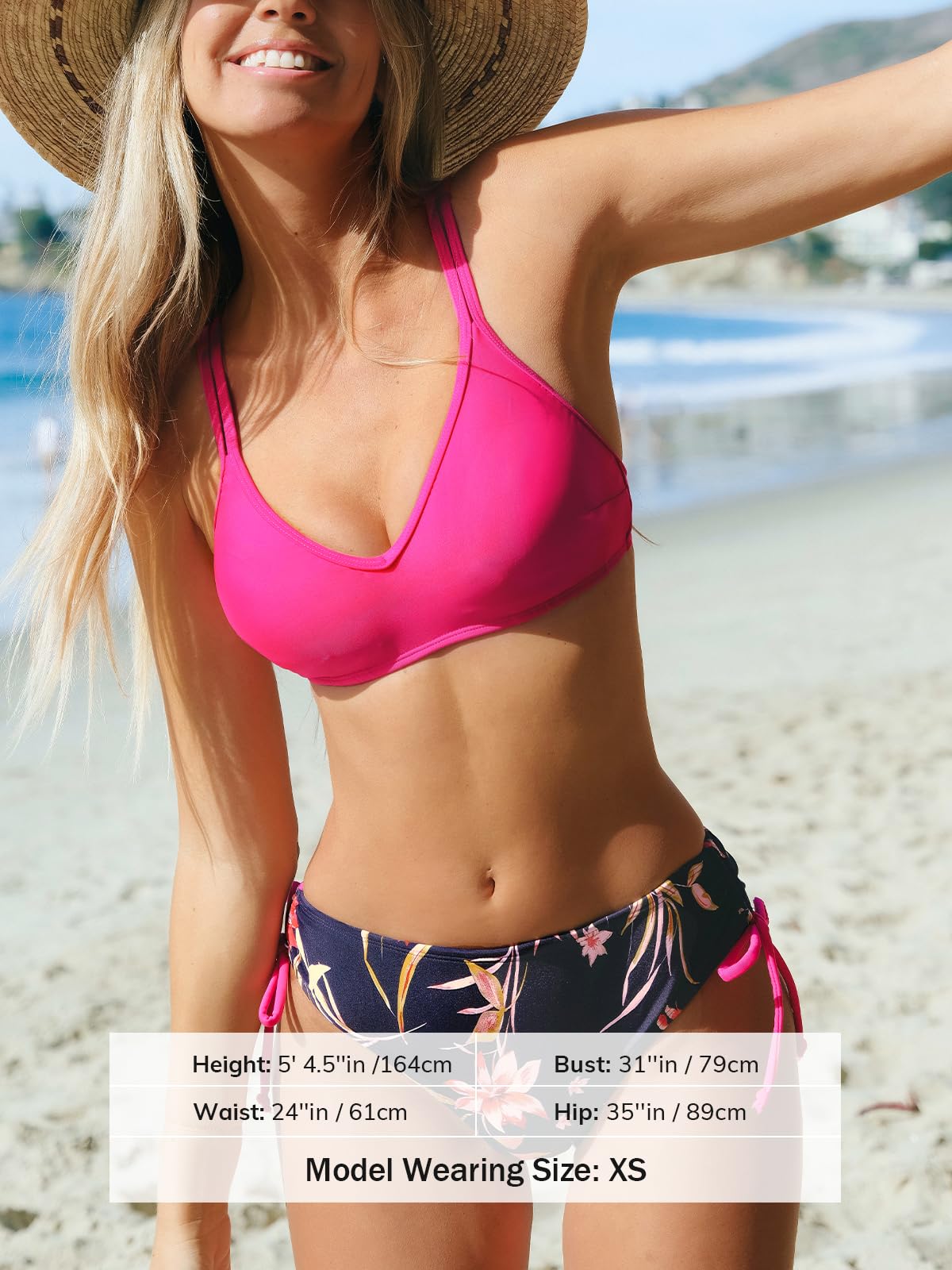 • Design: Crush on this flirty two piece bikini set with double spaghetti straps, featuring v neck and crisscross back. Matching a low rise strappy side tropical bottom piece. About cup style: with removable pads