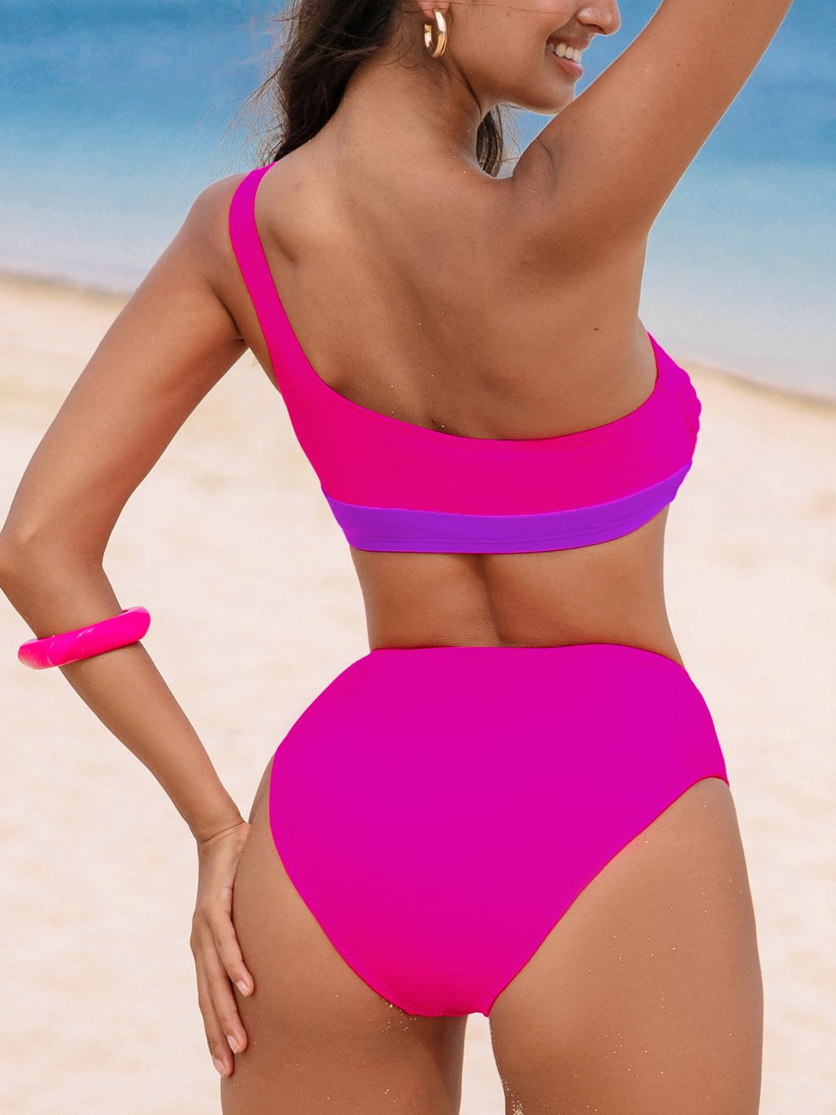 • Design: The color block two piece swimsuit features one shoulder asymmetrical neck design. The cheeky bum coverage and high cut leg bikini bottom with V high waisted detail can make you flattering.