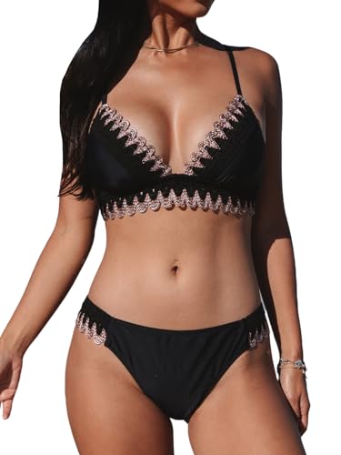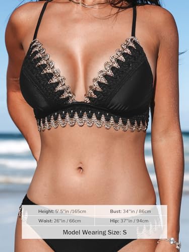 CUPSHE Women's Bikini Sets Two Piece Bathing Suit Plunging Deep V Neck Mid Rise Crisscross Self Tie Cheeky, M Black