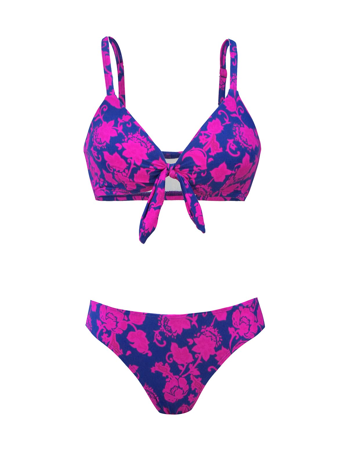 CUPSHE Women's Bikini Sets Two Piece Bathing Suits Floral Print Knot Bunny Tie, M Blue/Magenta