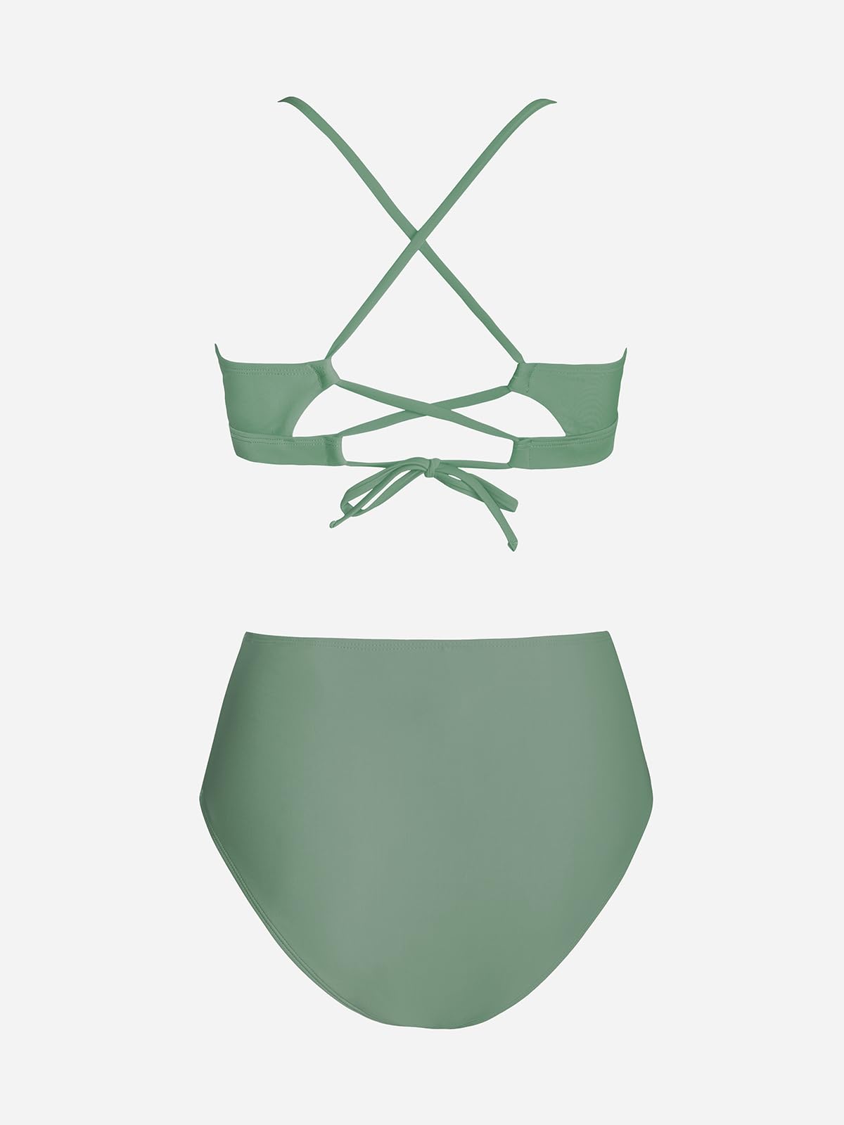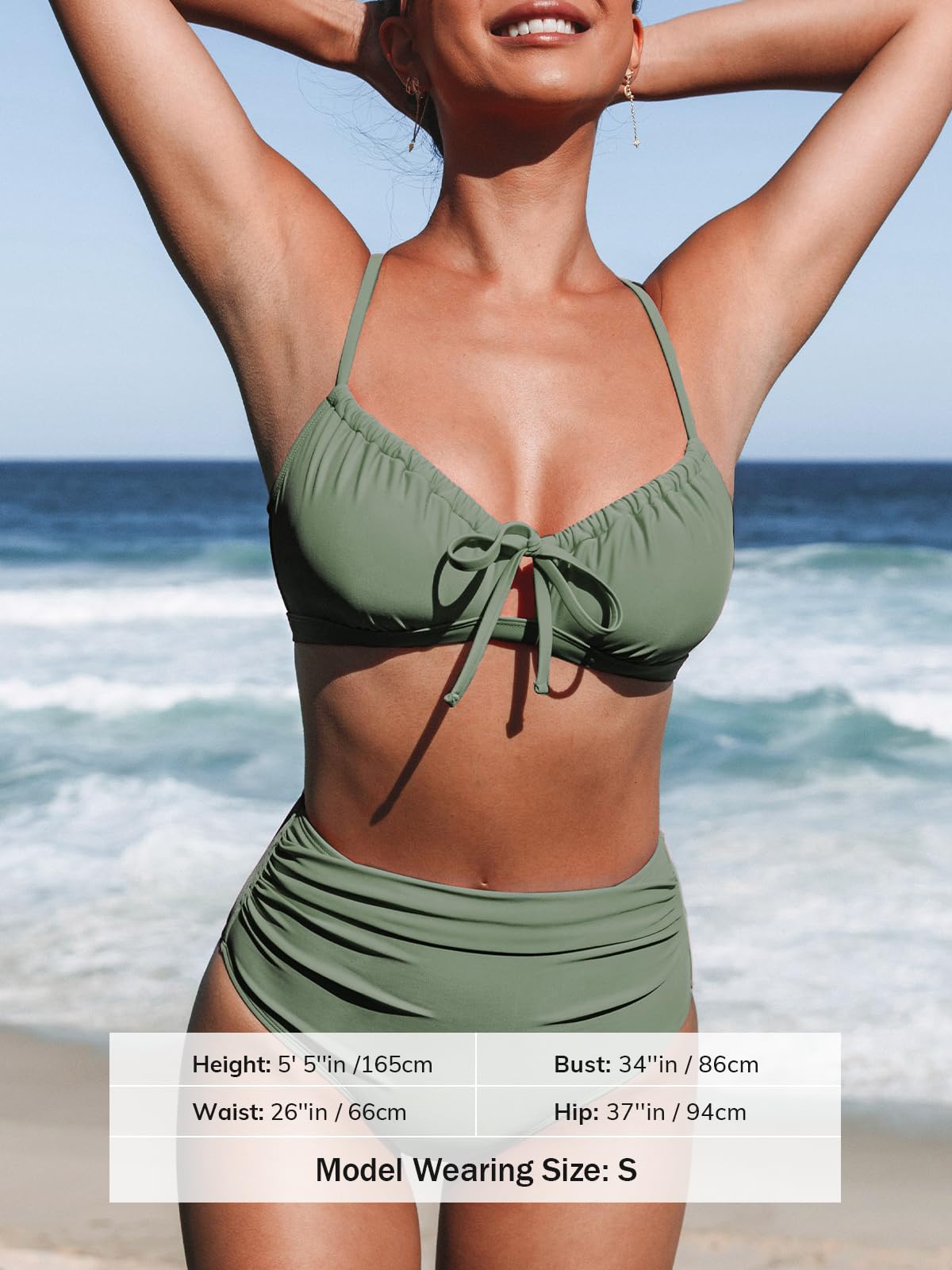 CUPSHE Women's Bikini Sets Two Piece Swimsuits Scoop Neck Crisscross Back Self Tie High Waisted Ruched, M Olive Green