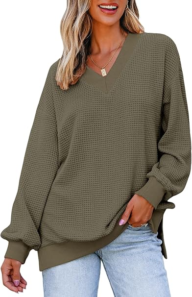 Dokotoo Womens Tops Long Sleeve Oversized T-Shirts Waffle Knit Shirt V Neck Casual Blouses Tunic Top Fall Outfits 2024