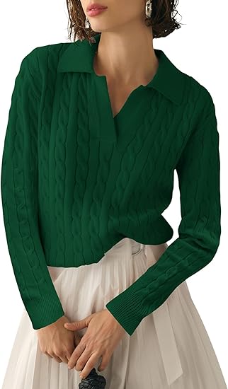 Micoson Womens Fall Long Sleeve Sweaters Lapel V Neck Cable Knitted Pullover Casual Soft Jumper Top