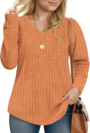 Plus-Size-V-Neck-Womens-Tops Dressy Long Sleeve T Shirts Trendy Lightweight Knit Sweaters Casual Loose Pullover Tunic