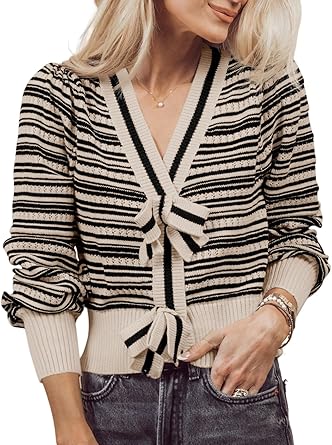 Saodimallsu Womens Striped Cropped Sweaters V Neck Cute Bow Tie Puff Sleeve Loose Knit Trendy Pullover Sweater