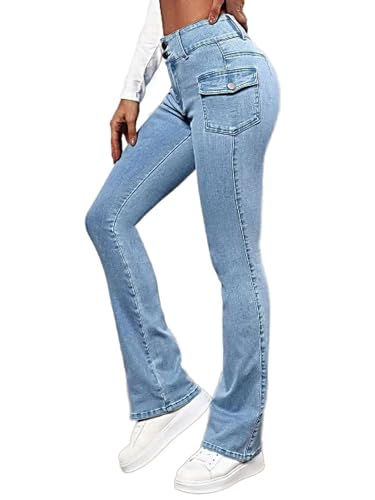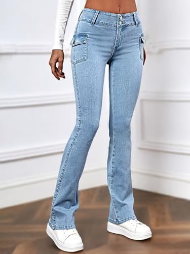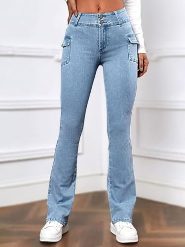 Flamingals Women's Flat Pocket Side Flare Jeans for Women Tummy Control Straight Leg Jeans Light Blue S