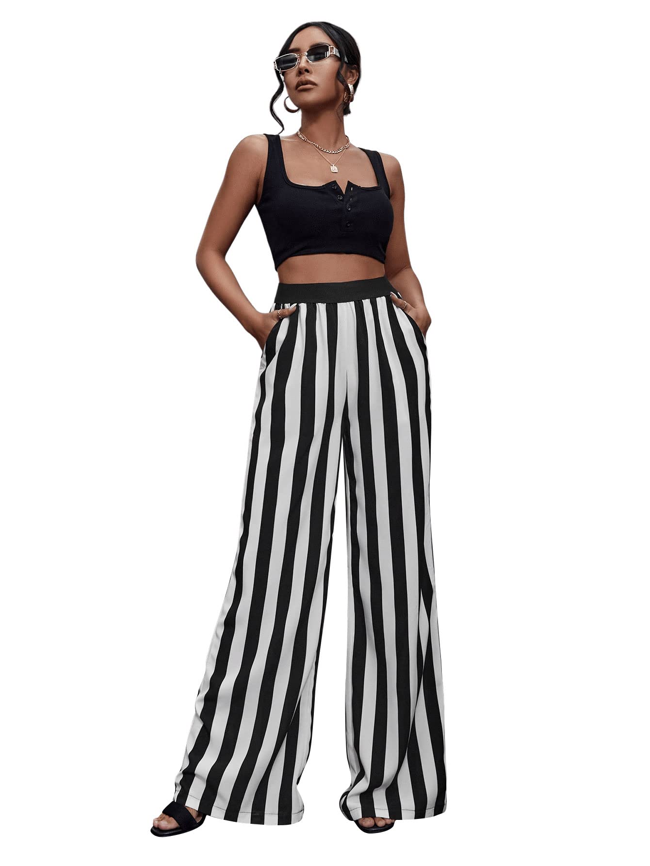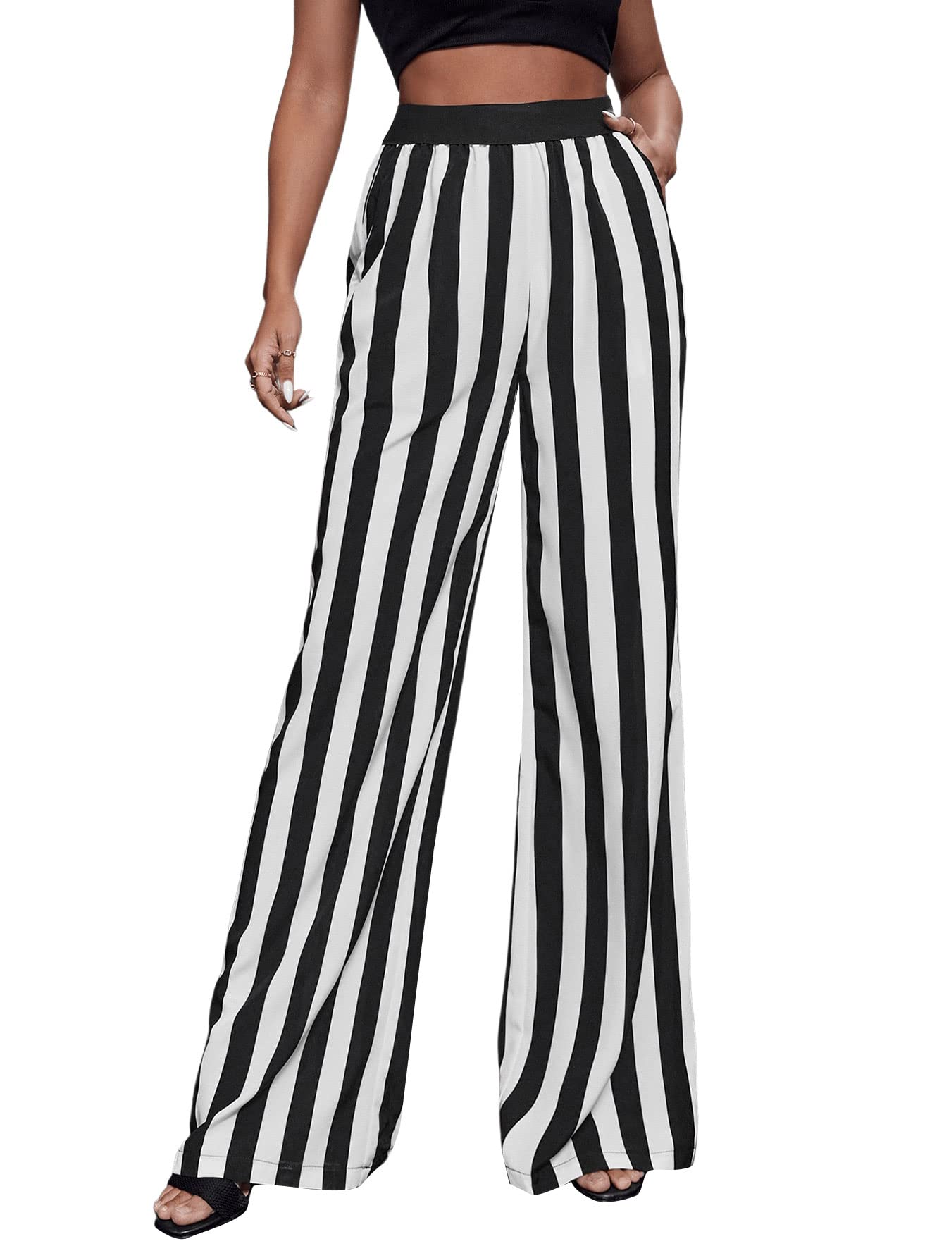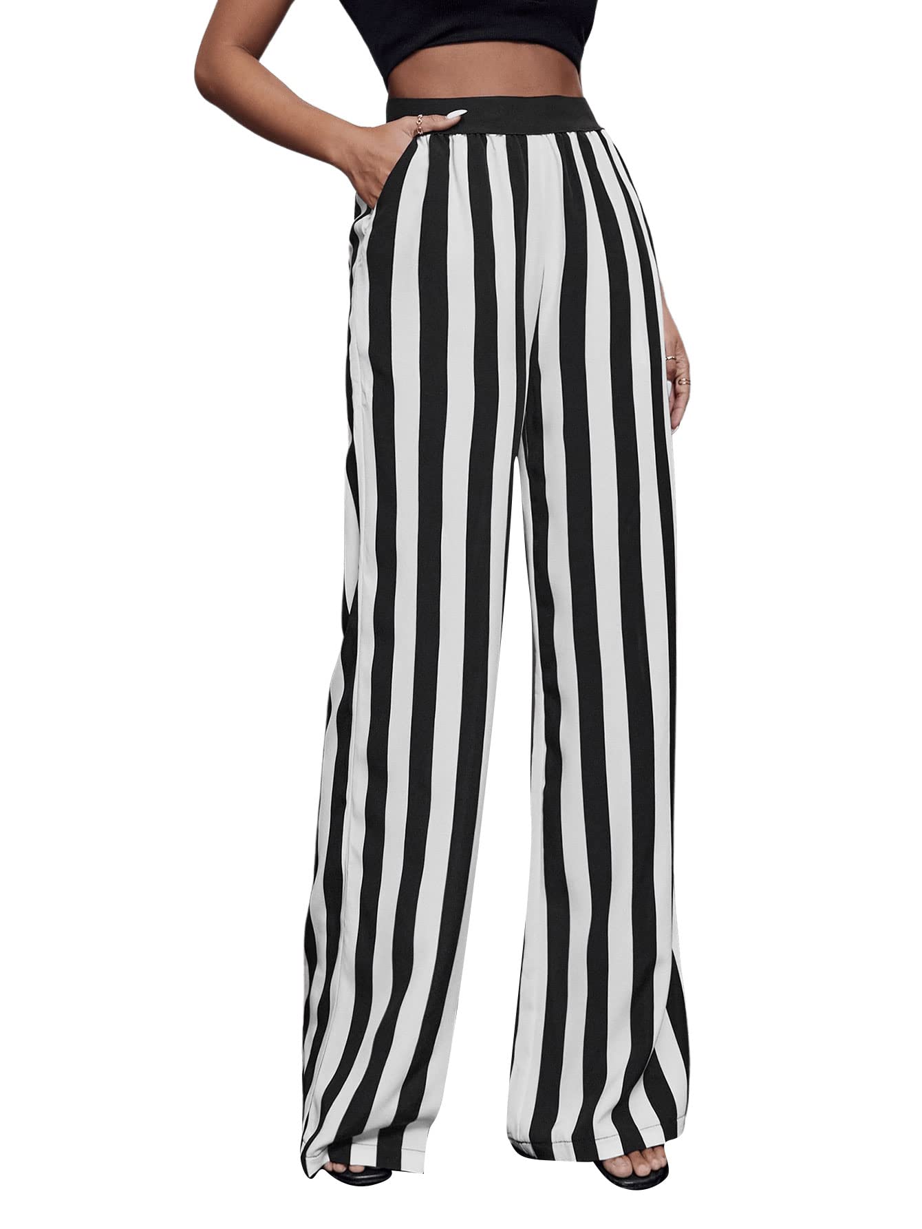 SweatyRocks Women's Striped Extra Long High Waited Wide Leg Pants Loose Casual Trousers with Pockets Black White S