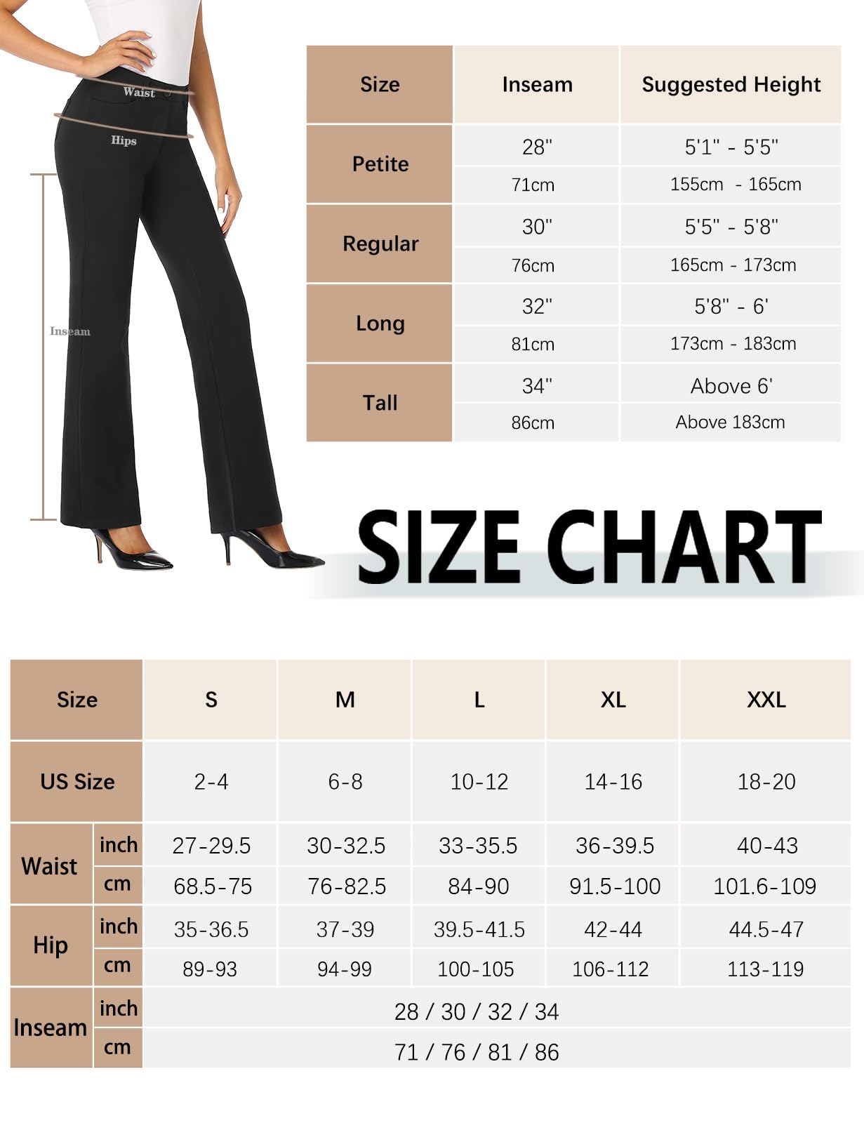 • 4 INSEAM LENGTHS: These womens dress pants feature with four inseam lengths: Petite - 28" inseam fits women 5'1" - 5'5" / Regular - 30" inseam fits women 5'5" - 5'8" / Long - 32" inseam fits women 5'8" - 6'/ Tall - 34" inseam fits women above 6'. Please refer to the size chart shown on the last picture for your right length of pants. Tall pants for women, long pants and petite pants are available.