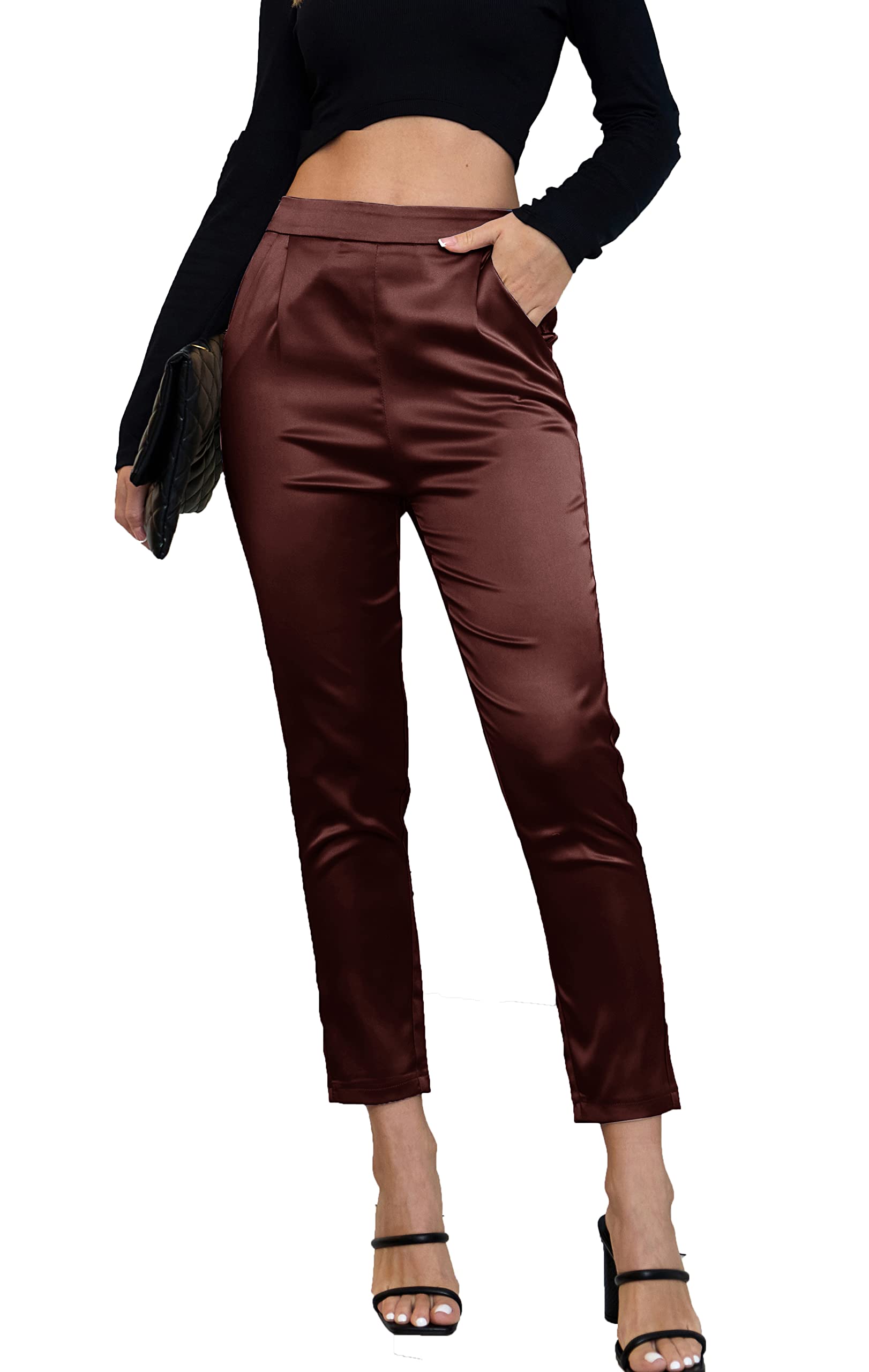 Women's Satin Silky Pants Dress Casual High Elastic Waist Trousers with Pockets