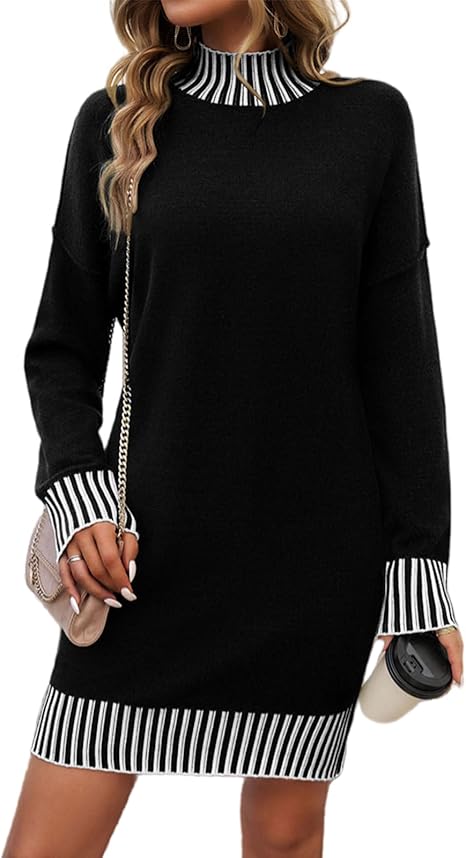 Womens Sweater Dress Long Sleeve Striped Knit Dresses for Women Casual Loose Mock Turtleneck Mini Dresses