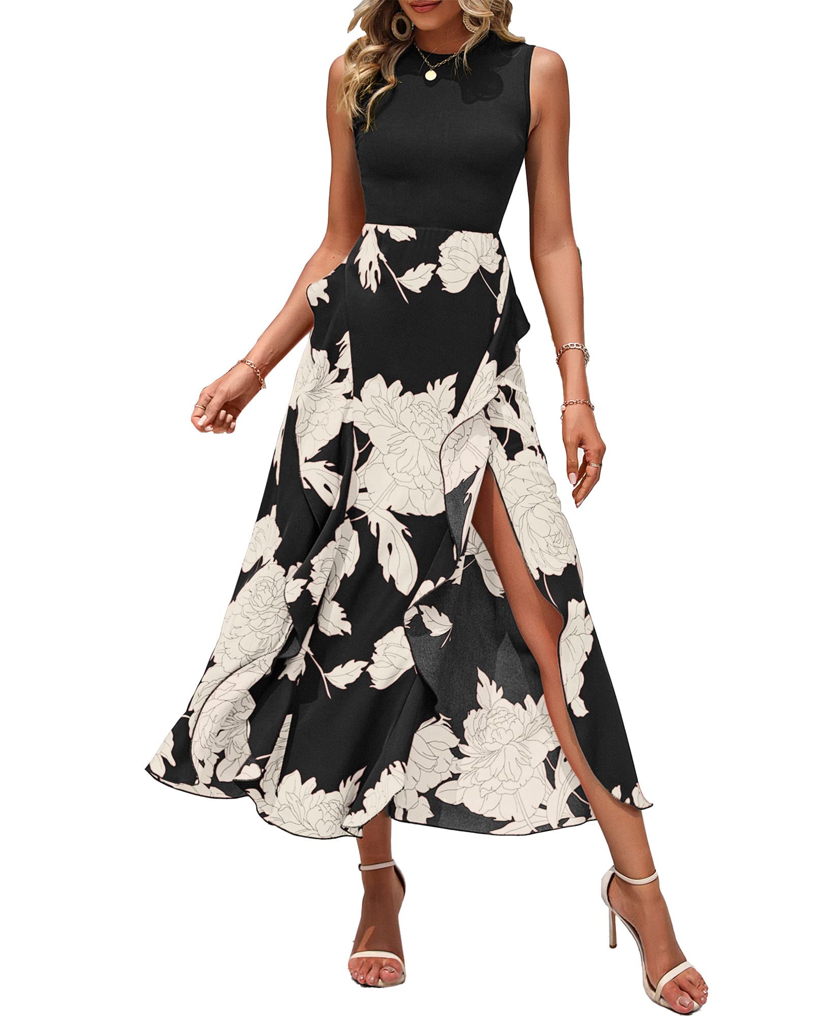 • FEATURES: Summer Dresses For Women 2024 / Sleeveless Sun Dress / Patchwork Midi Dresses For Women / Floral Dress For Women / Boho Dress For Women / Crew Neck / Stretchy Solid Color Knitted Tank Top / Elastic High Waist / A-Line Shape / Floral Print Skirt Part With Ruffle Layer Trim / Asymmetrical Split Hem / Invisible Zipper At Back / No Pocket