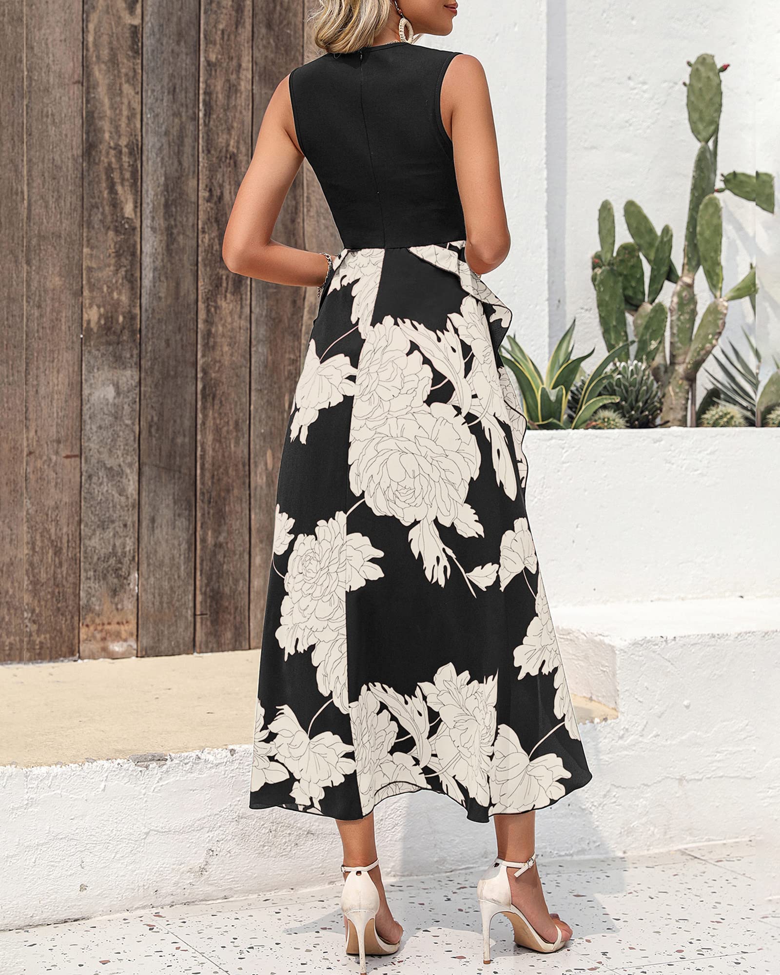 BTFBM Women Casual Sleeveless Summer Dresses 2024 Spring Crewneck Patchwork Boho Floral Ruffle Cocktail Party Midi Dress(White Floral Black, Large)