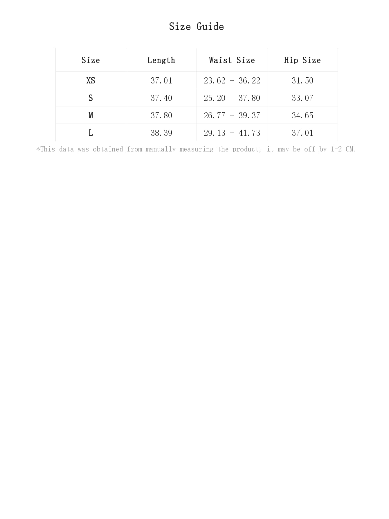 S:Hip Size:33.1IN,Length:37.4IN,Waist Size:25.2-37.8IN