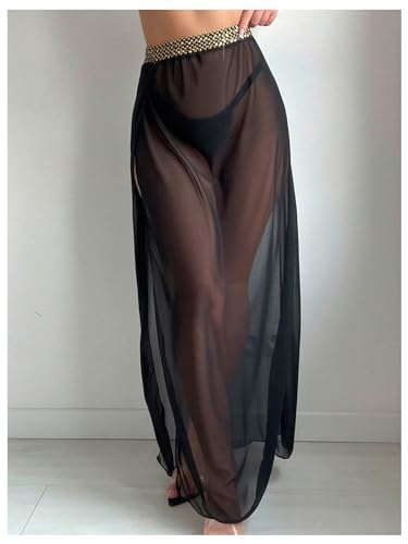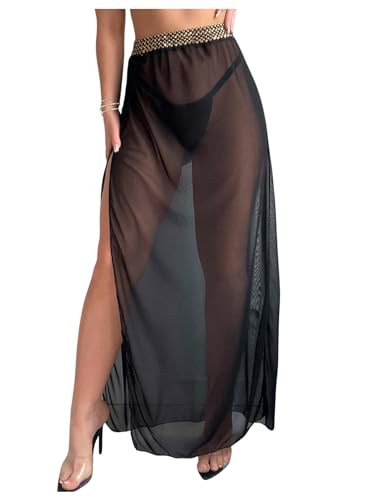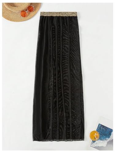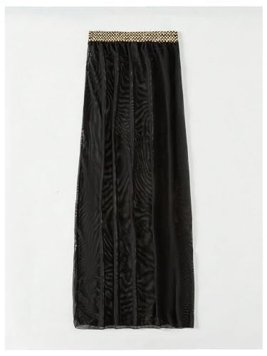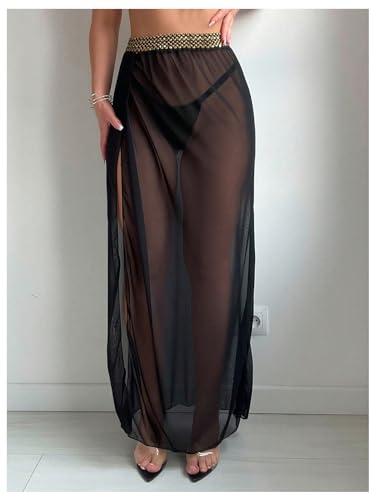 • Feature: Stitch Tape, High Waisted, Split Side, See Through, Sheer Mesh, Coverup Maxi Skirt for Women