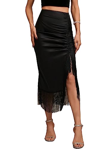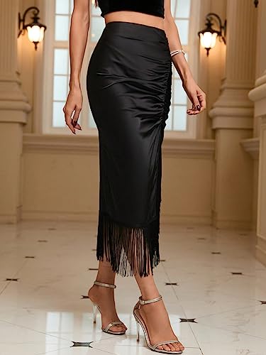 Milumia Women's Elegant Satin Fringe Trim Ruched Midi Skirt High Waist Asymmetrical Long Skirts Black Medium