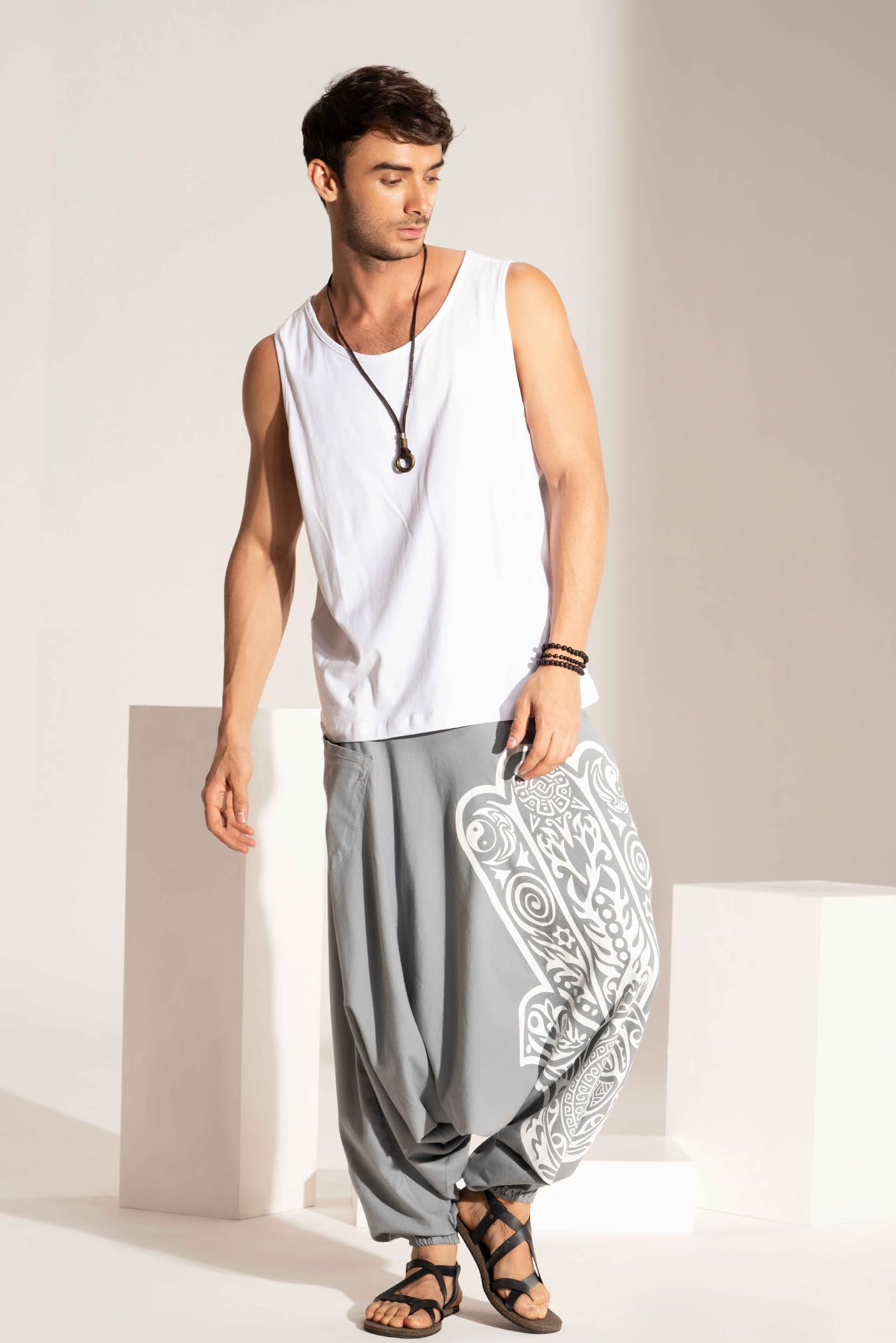 Boho Pants Elastic Ankle Harem for Men, Oversized Exercise Pajama Jogger Loose Boho Aladdin Pant, Twisted Wisdom Grey-White, One Size