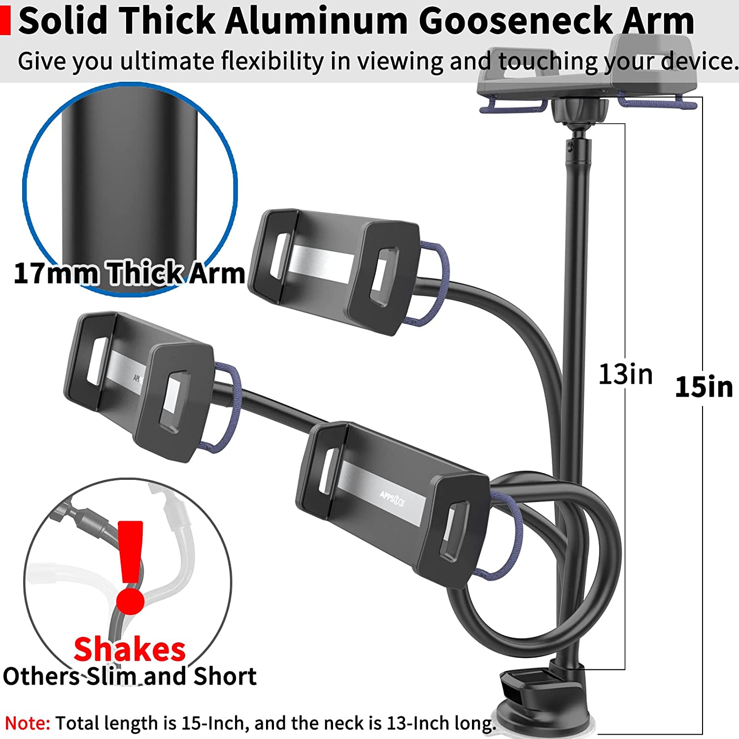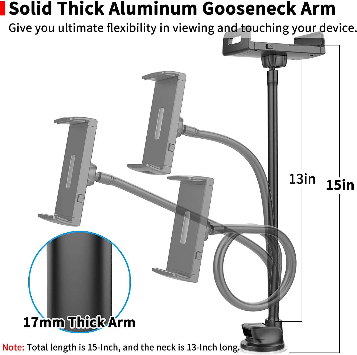 • NOTE: The length of the gooseneck arm is 13-Inch, and the total length of the tablet car mount holder is 15-Inch.
