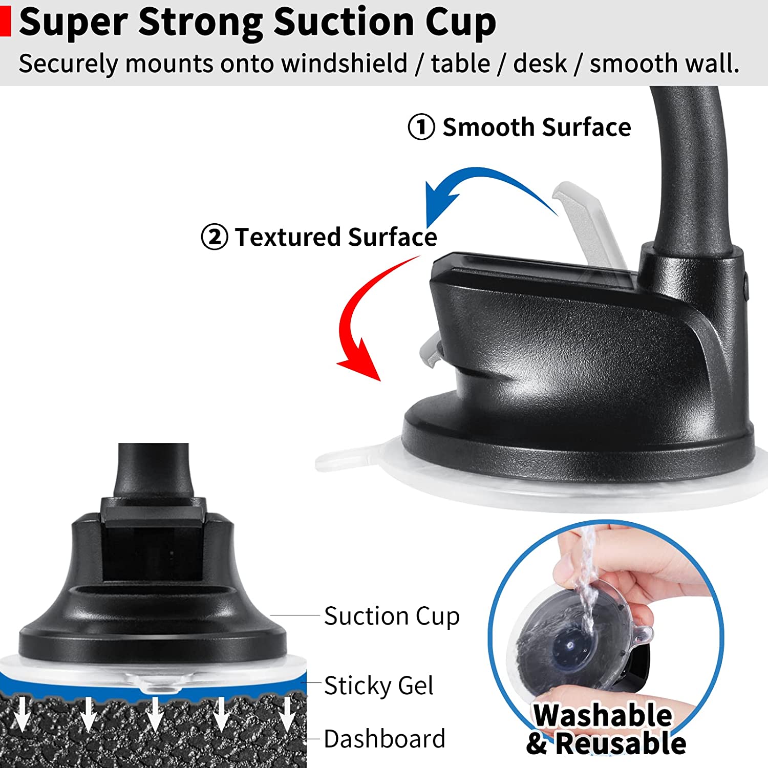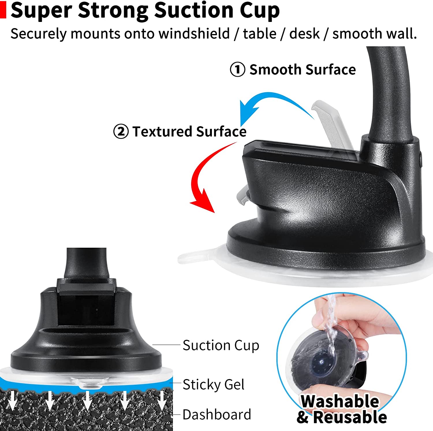 • [Strong Sticky Suction Cup] Two-stage locking suction cup has a sticky gel pad sticks securely to most flat surfaces, like the dashboard, wall, table, windshield, window. ▶ It can be restored to its mint condition by rinsing it with warm water and allowing it to air dry.