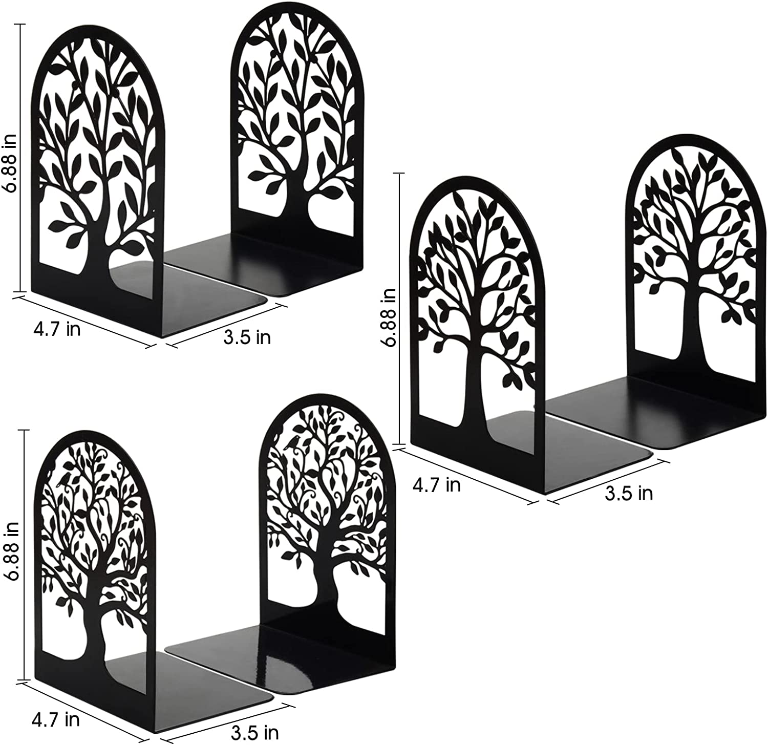 Bookends, Book Ends, Metal Bookends for Shelves Decorative, Tree Bookend Stopper for Heavy Books, Black Book Ends to Hold Books for Home Office, 6.5 X 4.7 X 3.5 Inch(3 Pairs/6 Pcs, Large)