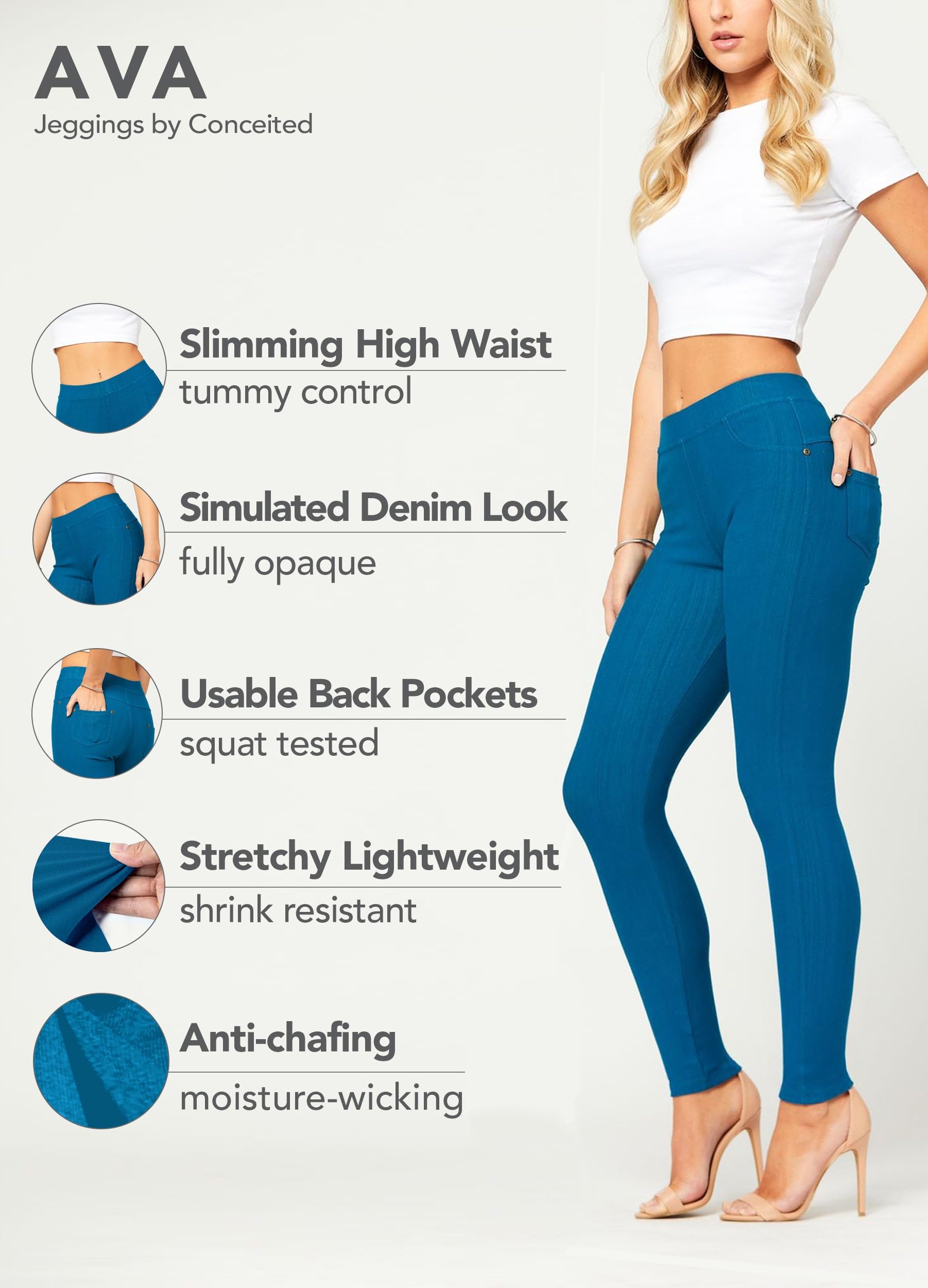 Details: In a blend of 75% cotton, 17% polyester and 5% spandex, our Conceited womens jeggings have achieved a simulated denim look in a much more comfortable premium offering. These slim fitting high waist jeggings for women come ankle length with 2 functional back pockets and in a variety of colors. These denim leggings for women are not only lightweight and shrink-resistant but also anti-chafing and moisture-wicking. The pull-on elastic high waistband of these Black jeggings for women provides tummy control and all-day comfort. Our denim jeggings for women is made of premium 4-way stretch fabric to ensure full opacity and is squat tested to provide full coverage for maximum support. Stretch fitted and tapered maternity leggings available in full length and capri length.