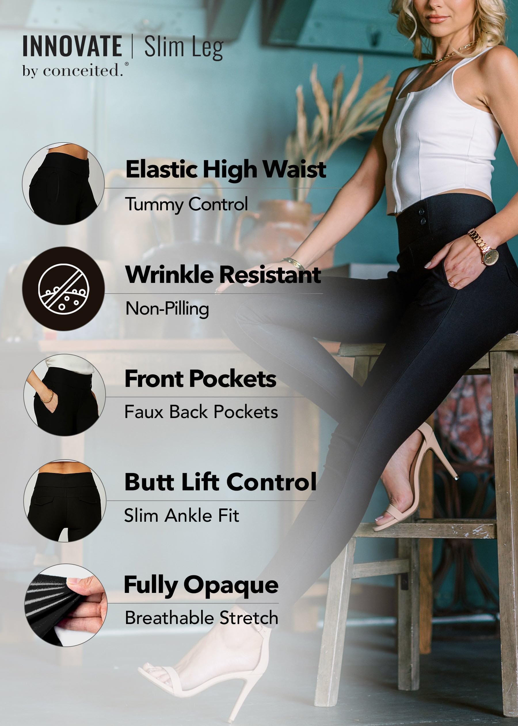 Details: Sleek and Smooth Pull-on style for effortless wear Thick double knit ponte material to firm and lift Hidden elastic high waistband to slim your waistline Tailored, clean lines give the illusion of elongated legs Functional front pockets and decorative welt faux-pockets in back Available in 6 sizes to perfectly mold every body type Style in a Snap Simplify your mornings! Pull on these ponte pants and instantly feel like the superstar you are. With a firm, flexible fit they hug your curves in all the right places without constricting your stride. Naturally slimming ponte fabric and full length silhouette will streamline your look and keep you moving all day. The perfect pants to take you from your bed to the boardroom in a breeze. Modern Classic Ponte pants are quickly dominating the workplace for modern women. Slip into these slacks and become the epitome of the stylish professional. Sitting high on the waist and fitted through the thighs, these pants create the poised look of your dreams. Stretchy yet structured, they are sure to be your favorite, and only you will know how comfortable they are. Grab a pair in all 6 neutral staple colors to effortlessly mix and match with your favorite tops.