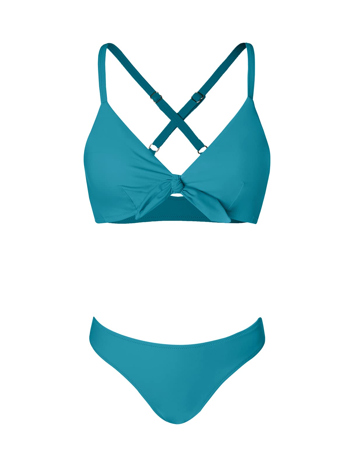 CUPSHE Bikini Set for Women Two Piece Swimsuit V Neck Knot Crisscross Low Waist Bathing Suit M, Teal Blue